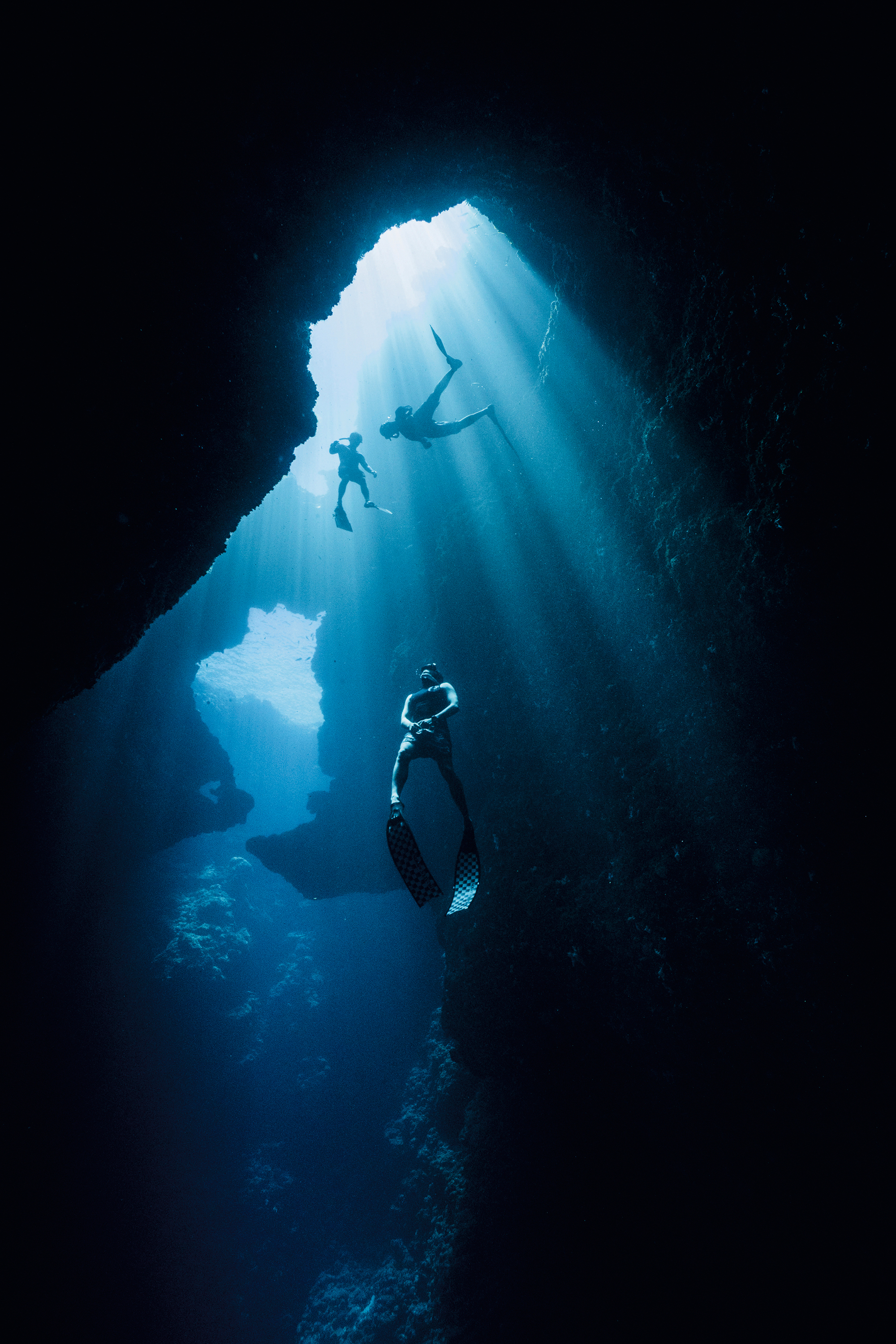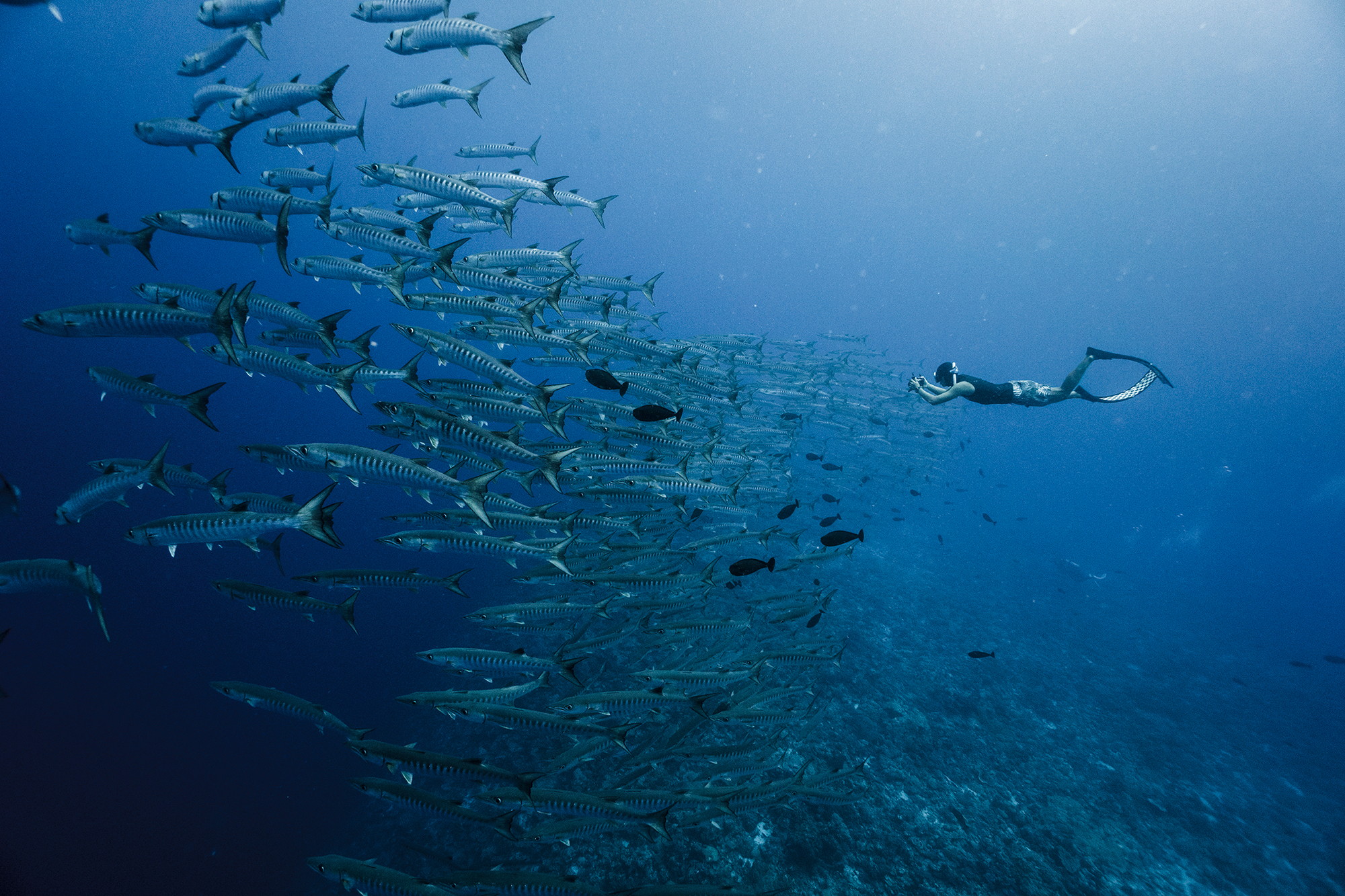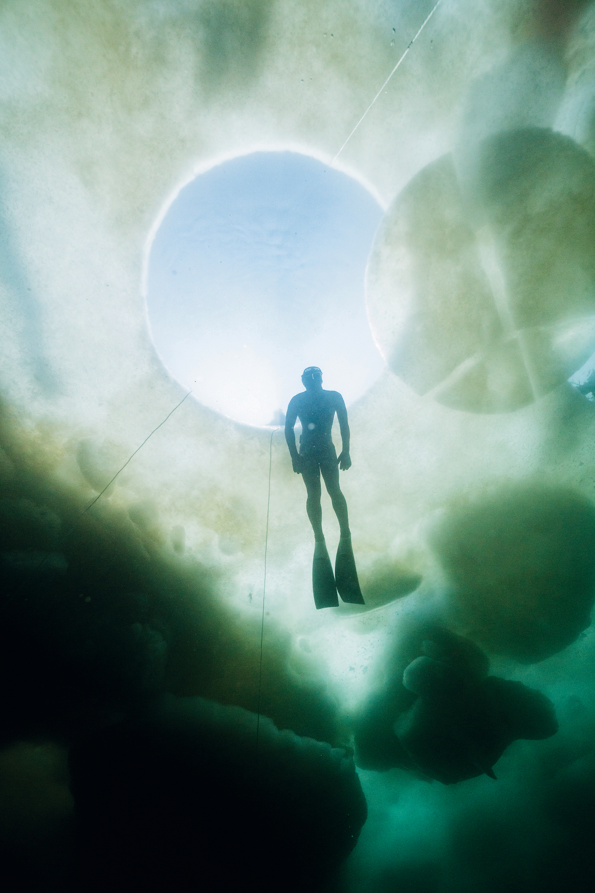 フリー・ダイビングで潜る時間は一回約90秒と、ごくわずかな時間のように思えるが、下へ下へと進んでいくと、有限の世界が無限へと広がっていき、広大な海での喜びに満ちた探索が続けられるのである。