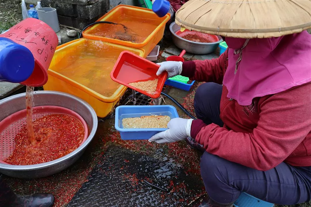 保管庫前の空き地では、スタッフがさまざまな品種のナスの種を選別していた。果肉を砕いて水を注ぎ、果肉と種子を分離させる。水に浮いた種子は空なので取り除き、残った種子の膜を除いて低温で乾燥させる。もう一つのグループは、種子をより分け、種類や数を確認し、重さを量って袋に入れて入庫する。トウガラシの種を担当するスタッフは辛さで涙ぐんでいる。