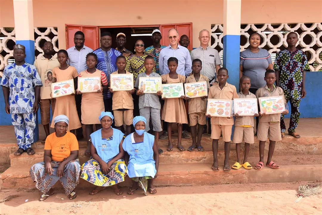 世界野菜センター主任のMarco Wopereis博士(後列右から4人目)はアフリカのベナン共和国で栄養プロジェクトを実施し、現地の子供たちと交流した。(亜蔬―世界野菜センター提供)