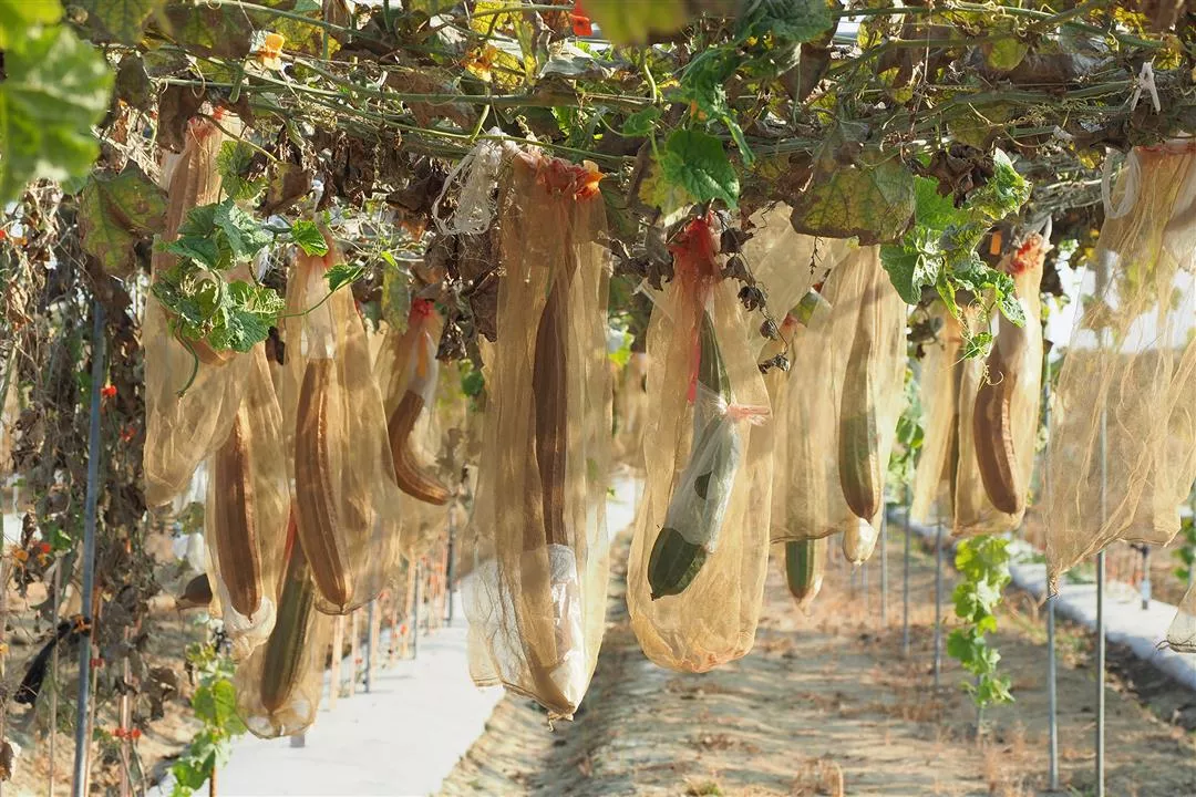 亜蔬―世界野菜センターの畑では、東南アジアから集めた色とりどりのヘチマが栽培されている。