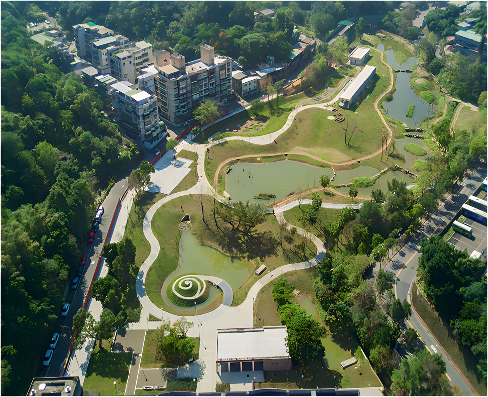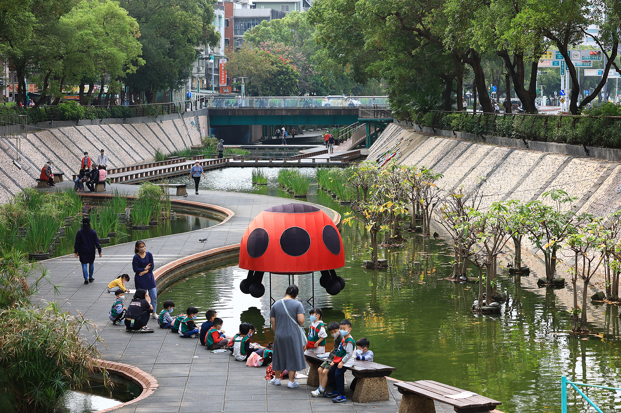 洪水レジリエンスの概念は、新たな視野と政策の革新をもたらし、公的部門の水害対策に今までにない可能性を開くものだ。2019年に水利法が改正され、「地表を流れる雨水を分担して引き受け、流出をコントロールする」という戦略が打ち出された。これまですべて排水溝や下水道が担ってきた地表の雨水の流れを、地面も分担するということだ。この法令は、政府と土地開発者に対して雨水の貯留を要求し、土地全体の洪水耐性を高めていくものだ。「人間が利用するあらゆる土地が、洪水防止の使命を負い、地表の雨水量を分担する機能を持つということです」と王芸峰は説明する。台北市の永春陂湿地公園や大港墘公園などが、これを実現するためのモデルケースとして挙げられる。