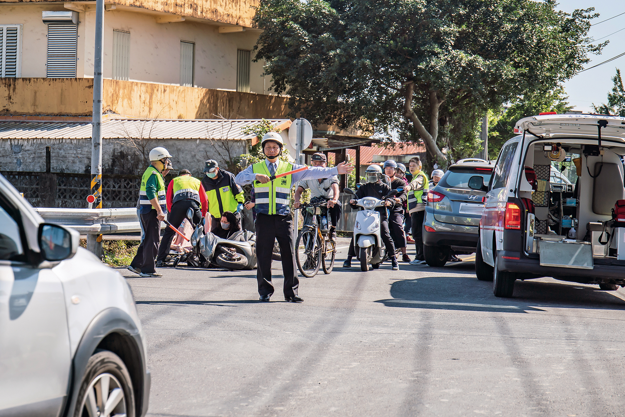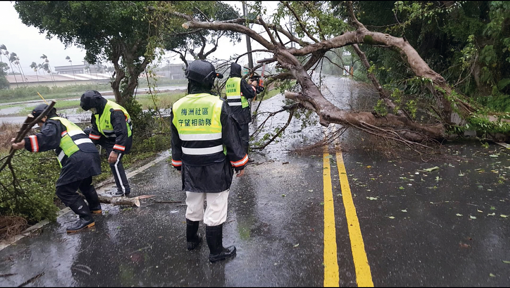 台風の暴風で街路樹が倒れても、外部に支援を要請することなく、自主防災隊が倒木を処理して道路を復旧させる。(梅洲地域水害自主防災隊提供)