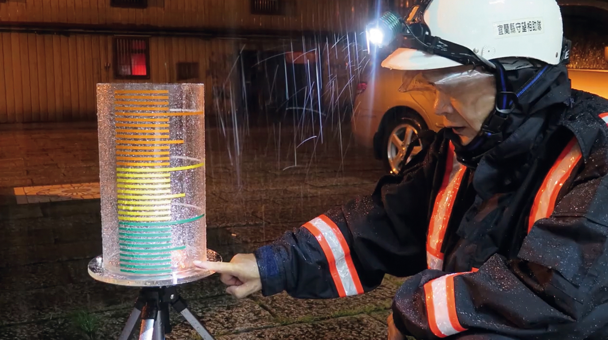 激しい風雨の中、台風による雨量を確認する呉文龍。 (梅洲地域水害自主防災隊提供)