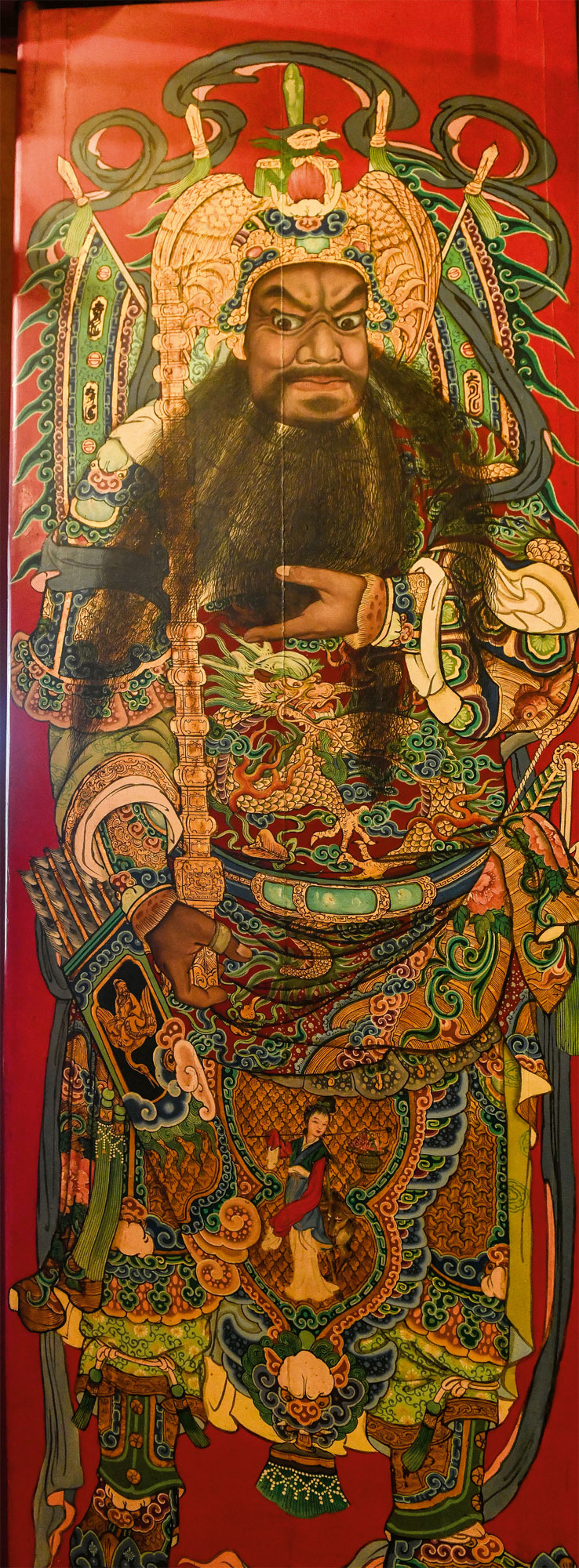 三川殿の門神は大家・陳寿آUにより1966年に制作され、六柱の門神はすでに60年近く寺を守ってきたことになる。だが、湿気を受け、西日に晒され、お香に燻され、損壊の程度はそれぞれである。今回、政府文化部は一般に修復工事の工程を理解してもらおうと、龍山文創パークに修復センターを設立し、ガラス越しに修復技術士の修復の状況を見学できるようにした。
