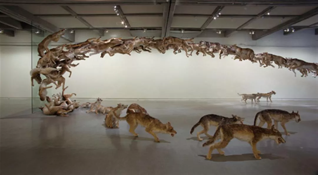 蔡国強は空間アーティストであり、野性味あふれる道具を用いて、何もない空間にスペクタクルを生みだし、また展覧会場の空間に合わせて変化させ、新たなイメージを表現する。左は99頭の狼を用いた「撞牆」、右は「時宜に合わず:舞台一」。