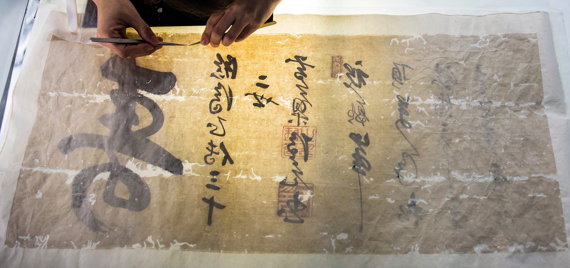 「中国では昔から表装修復が行なわれていましたが、重点は文物を本来の使用できる状態に戻すことに置かれていました。それに対して現代の保存修復は、文物の物質的状態を保持するだけでなく、その歴史背景や美、さらには本来の価値や観点なども同時に保存しなければなりません」と范定甫は言う。
