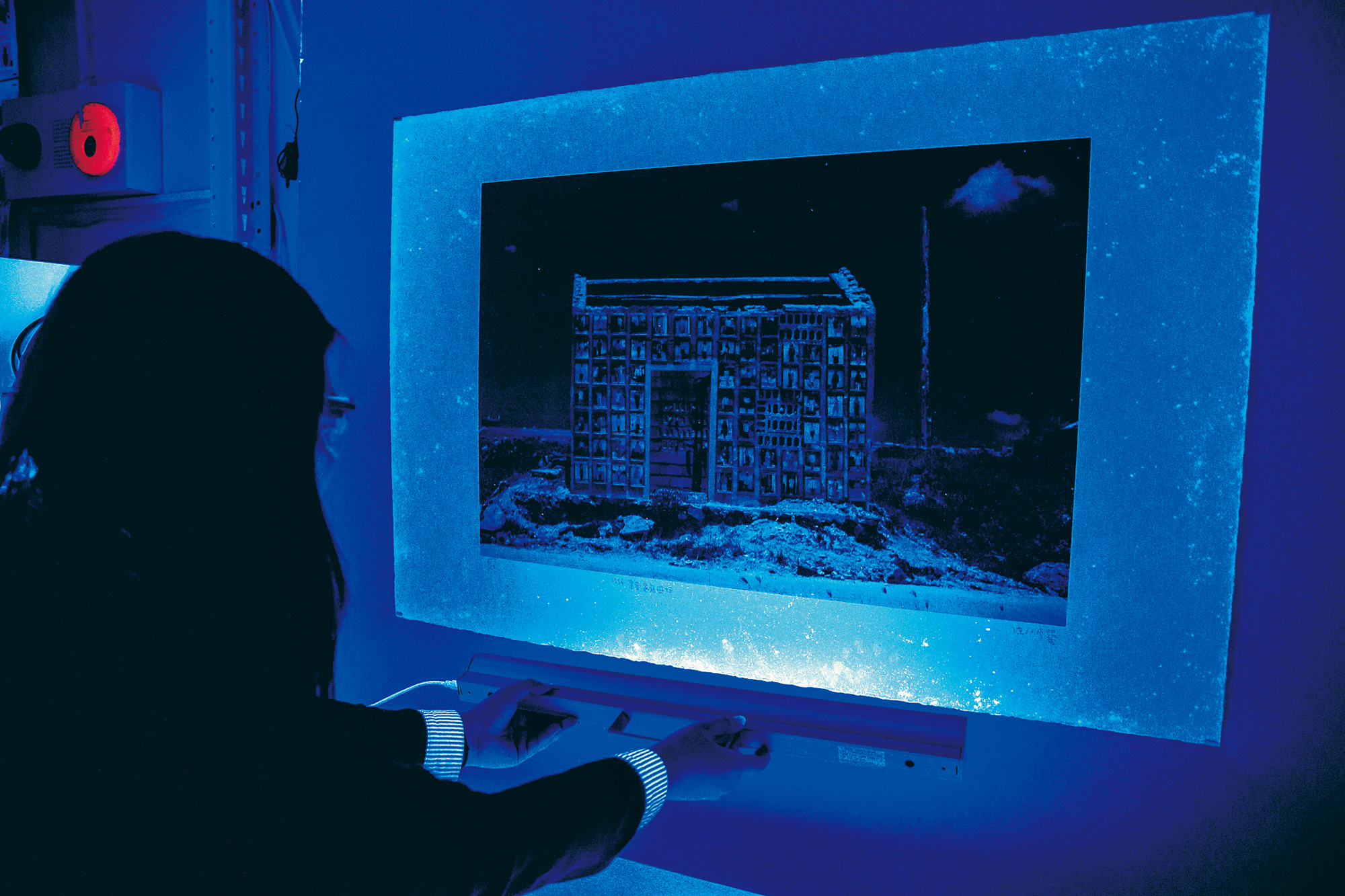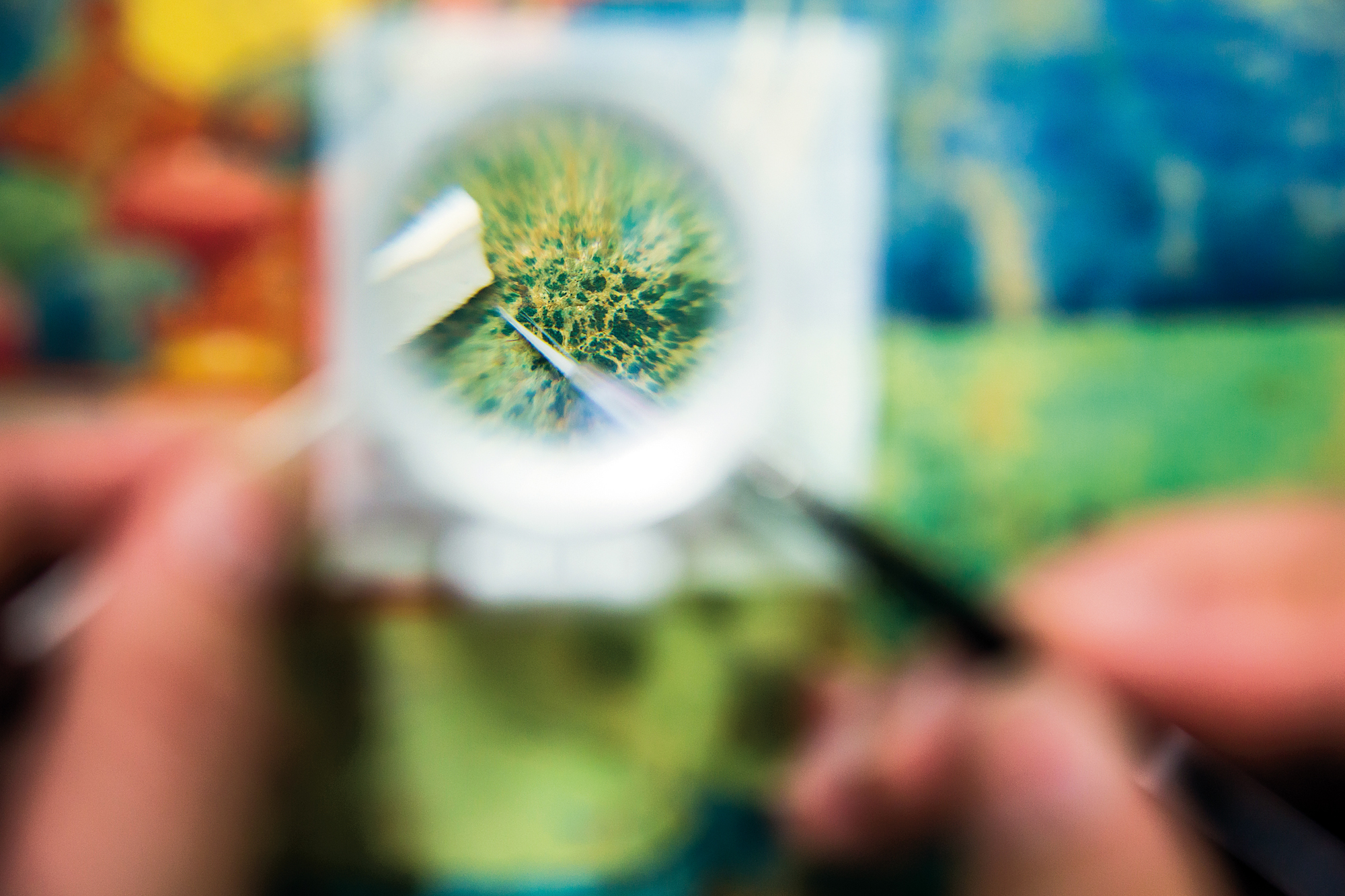 拡大鏡を用い、溶剤に対する文化財の反応をテストする。