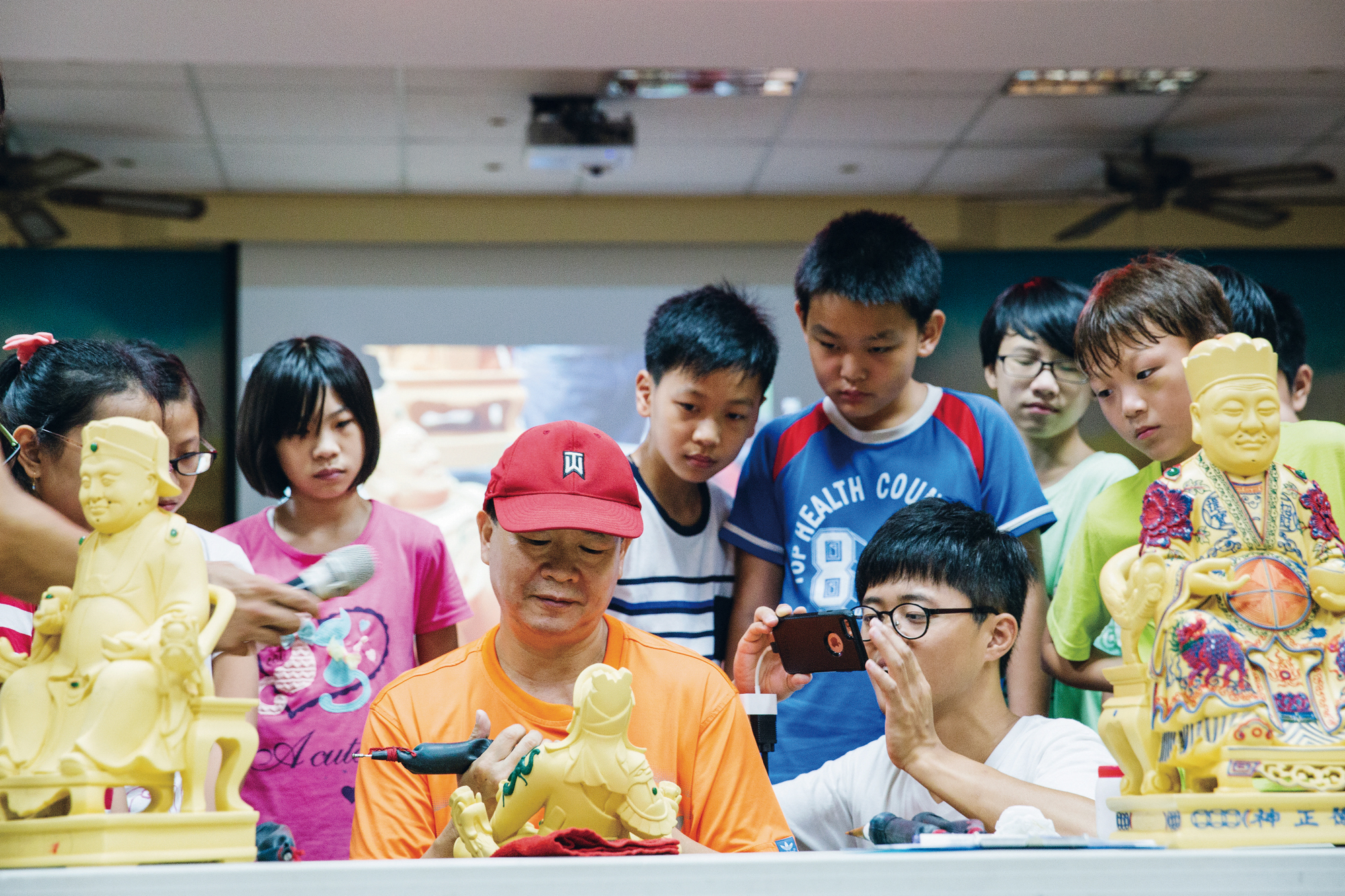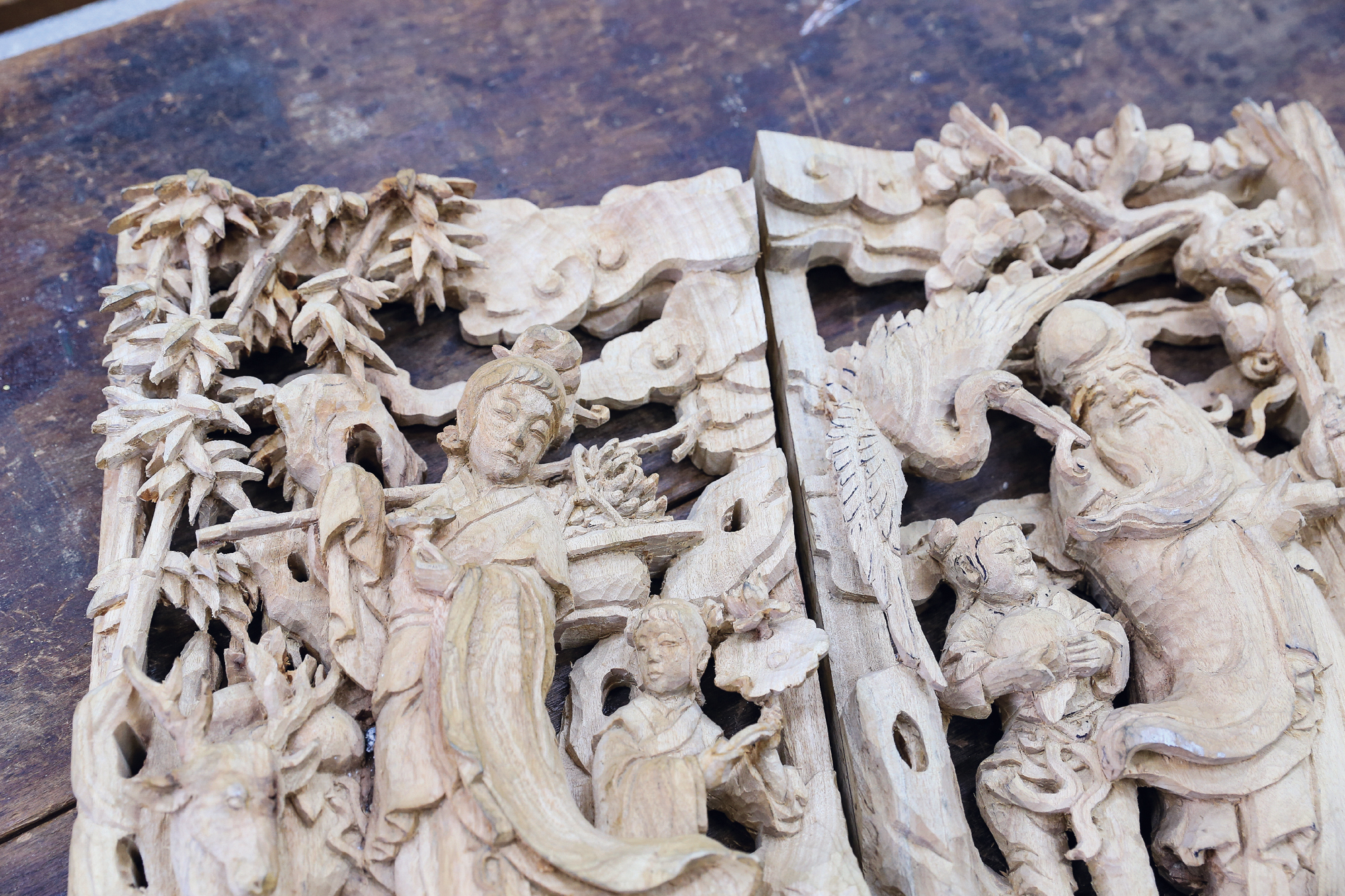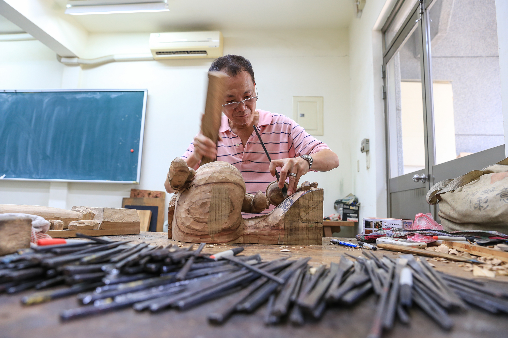 洪耀輝は常に静かに神経を集中させて作品と向き合い、熟練の腕で工具と技法を操る。こうして何の変哲もない木の塊が生き生きとした彫刻作品へと生まれ変わる。