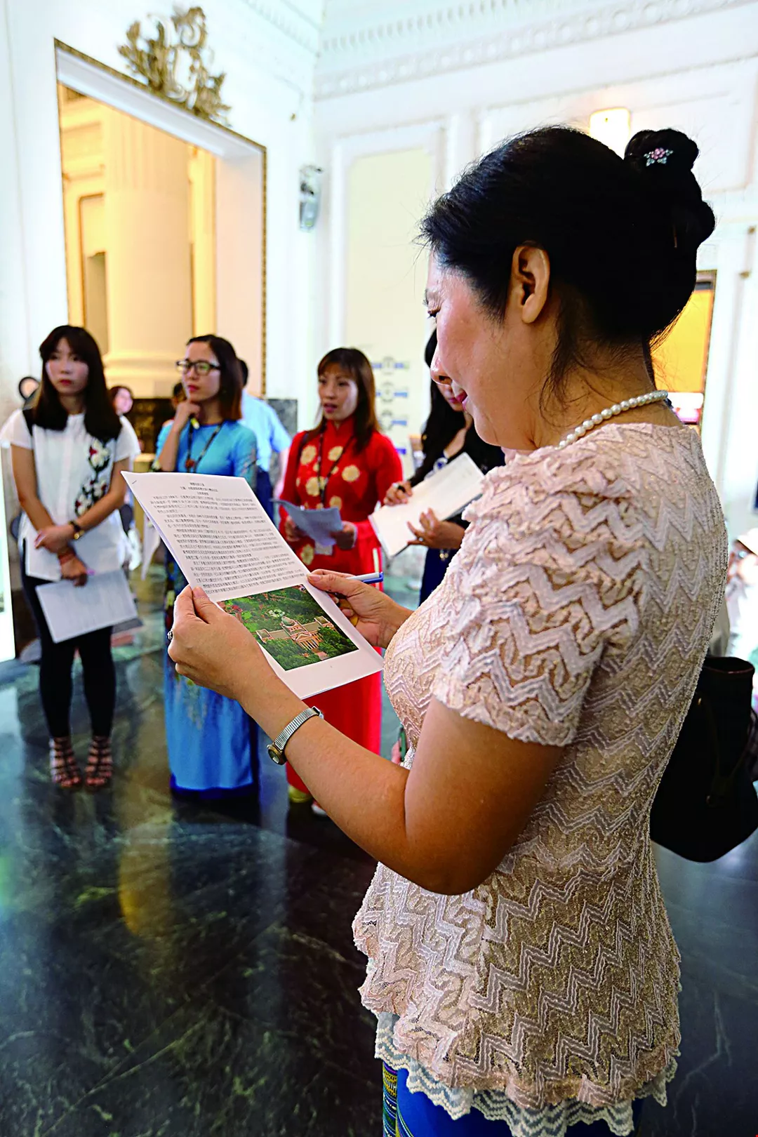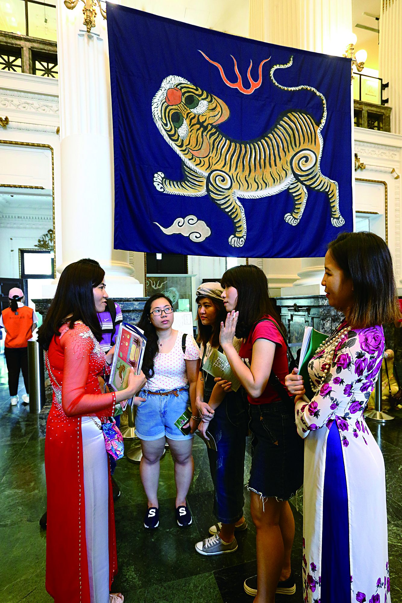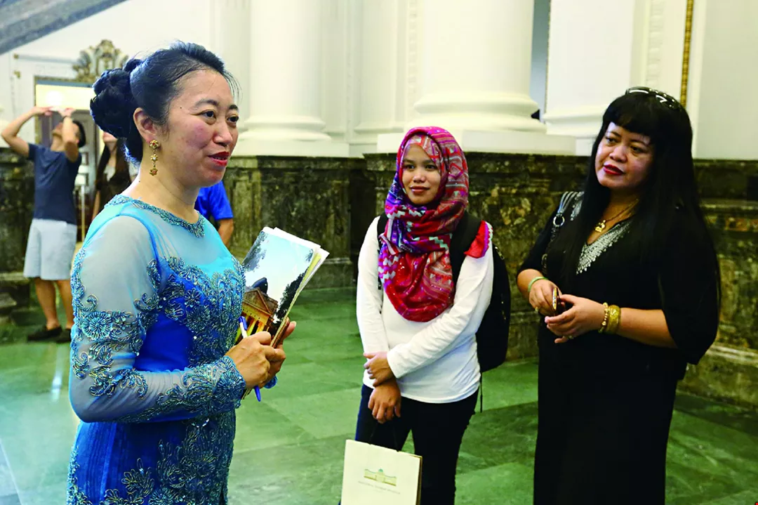 まだ訓練中のタイ出身の趙有学さん(右)、すでにガイドを務めているインドネシア出身の施鷺音さん(左)やベトナム出身の阮氏玉梅さん(中央)も、この仕事に情熱を注ぎ、自分の知識を同胞と分かち合いたいと考えている。