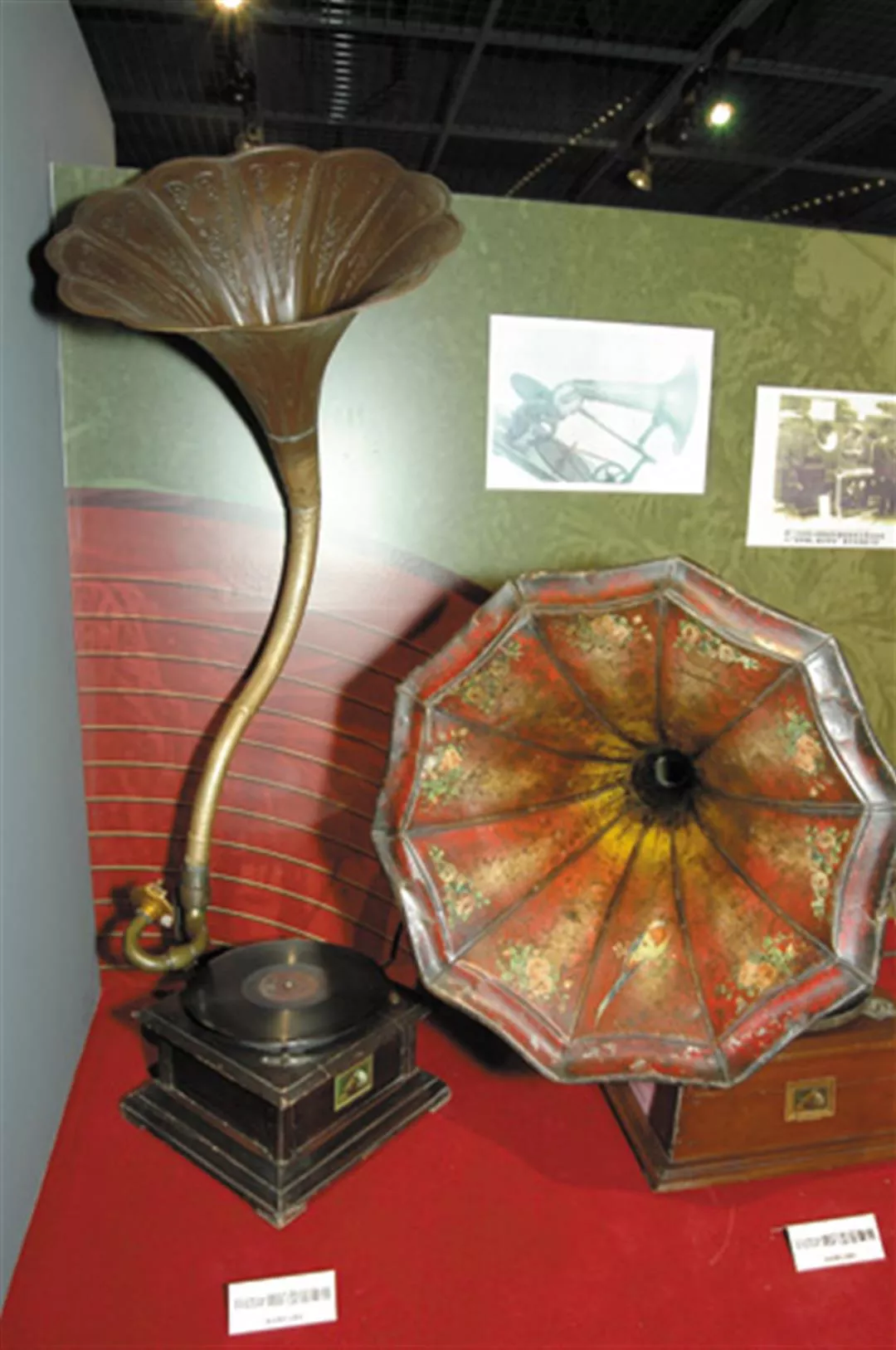 蓄音機は、1893年にレコードの量産が始まってから少しずつ普及し始めた。構造はターンテーブルにレコード針、共鳴箱とホーンというシンプルなものだが、大きくて重い機械である。1904年、日本でユリの花のようなラッパをつけた美しい蓄音機が作られ、蓄音機の外観は美しいものへと変っていった。