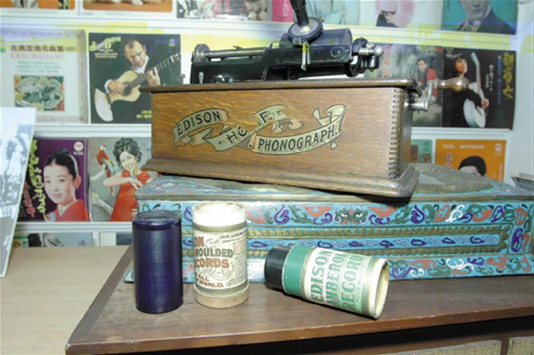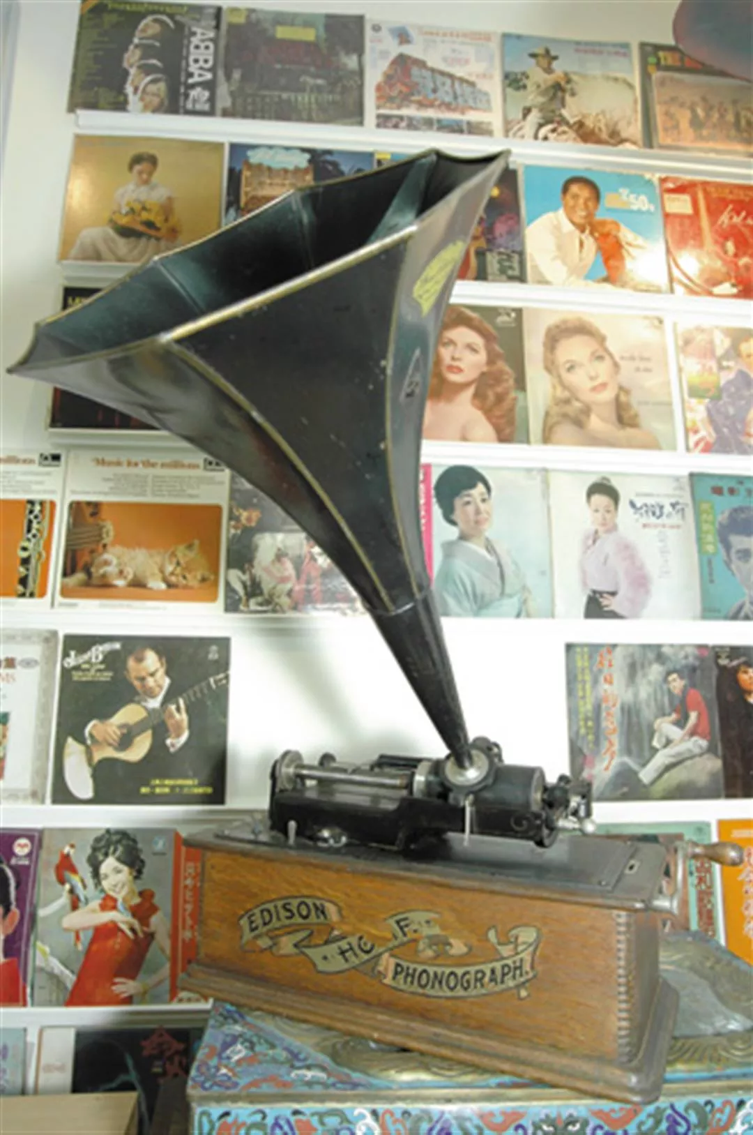 林本博さんは円盤型蓄音機の他に蓄音シリンダーやレコード、レコード針や修理道具も収集している。数千曲を数えるレコードの中には、かのエジソンが蓄音機を発明した当初に使用したシリンダー型のもの、それにエジソンが競争のために作った厚さ0.7ミリという円盤型レコードもある。録音内容は、日本時代に台湾で創作された歌謡曲、歌仔戯、日本の懐メロ、上海の1930年代の流行歌、アメリカの30年代のポップス、インド歌謡、それに戦後の台湾のレコードなどだ。蓄音機を買った時に一緒にもらったものもあれば、チャリティー展示会などで同好から贈られたものもあるが、大部分は彼が古物商や蚤の市で手に入れたものだ。