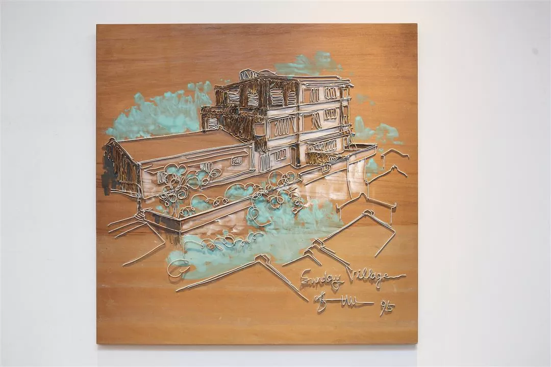 胡達華の初期の作品にも同じく九份の景観が描かれているが、主な素材はネジや釘、針金である。