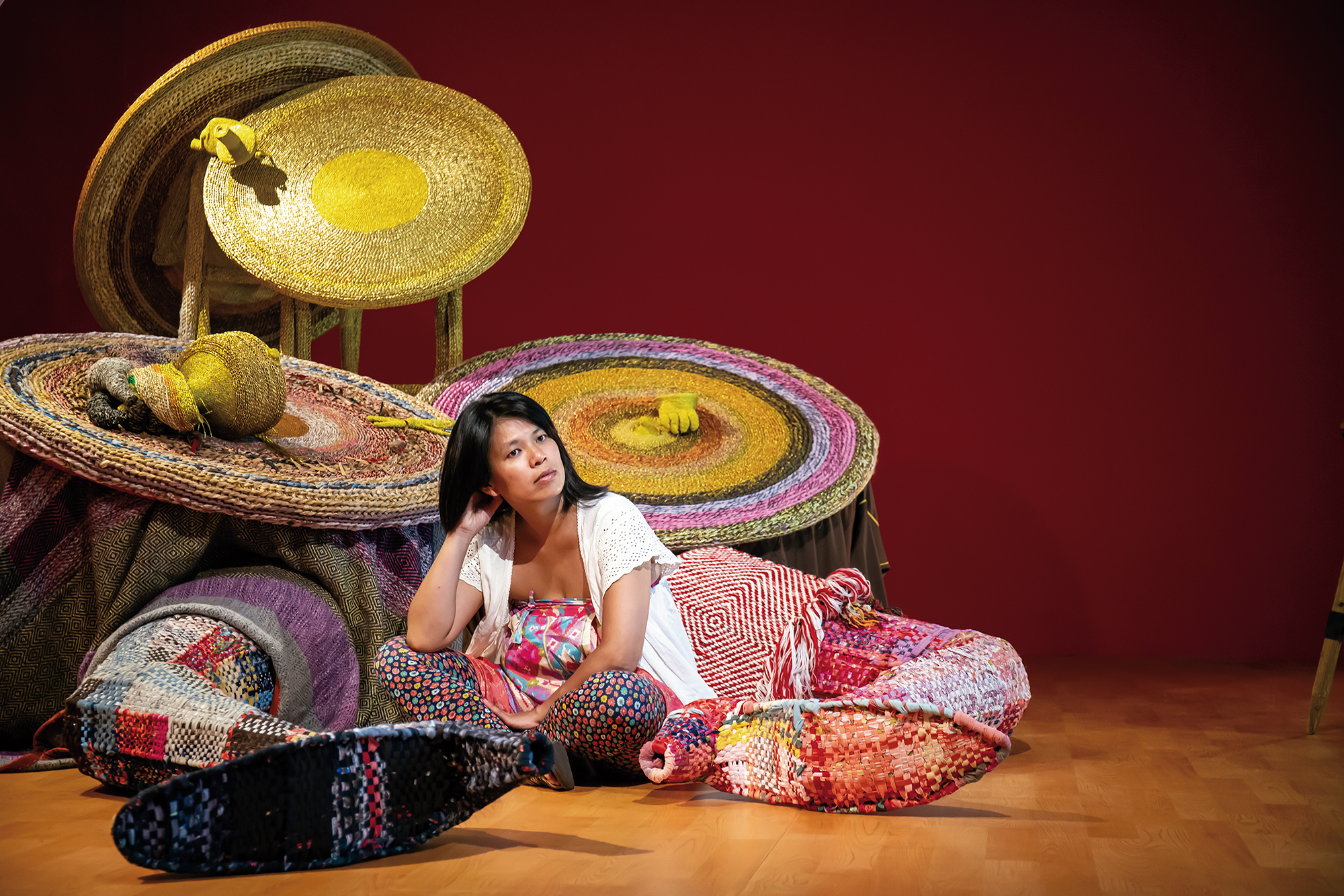 例えば今年(2020年)、桃園原住民族文化会館に展示した「倒地媽媽」という作品は、三つの大きな部分から成り立っている。彼女は円卓や鍋、自分で作った金属の支柱などを織物で包み、それらを組み合わせて母親のような形を作った。円卓は女性の乳房を表し、そこへお乳を求める子供の手を添えた。傍らにあるハサミは「子供の乳離れを願う思い」だと林介文は笑う。