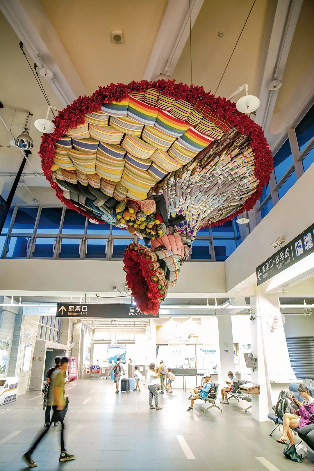 新城駅構内に飾られた大型のインスタレーション「織路」は、林介文が集落の女性たちと共同で完成させた作品だ。