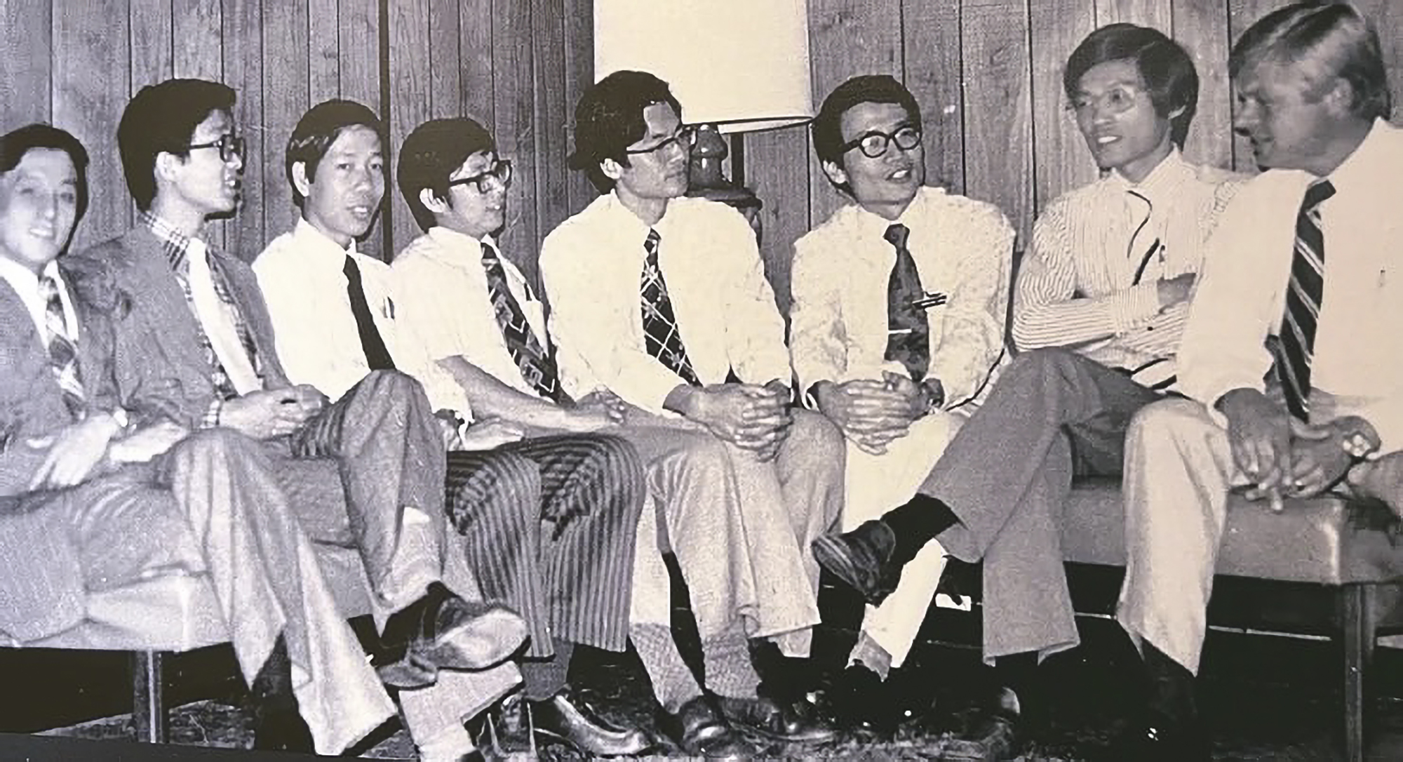潘文淵氏(前列右から2人目)は生涯台湾から給与を受け取ったことはなかったが、台湾初のIC技術開発計画を立案し、半導体産業の草創期における重要な推進役となった。写真は1976年、史欽泰氏(前列右から1人目)と楊丁元氏(前列左から1人目)がRCAで研修中に潘氏と記念撮影したもの。(潘文淵基金会提供)