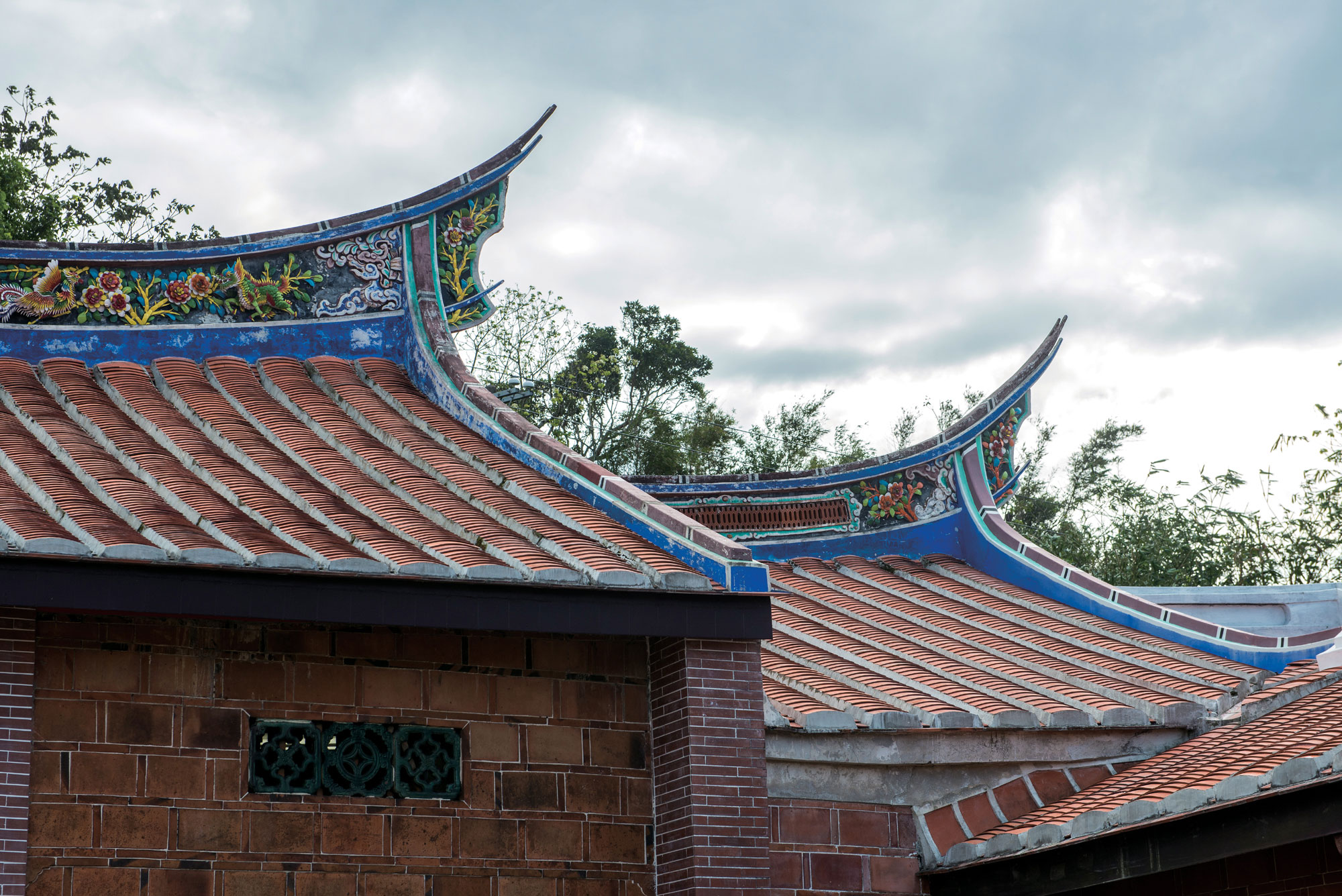新竹県新埔鎮にある呉濁水の旧宅は、伝統的な三合院建築で、青空と黄色く実った田圃の間に赤い瓦屋根が燕尾のように美しい曲線を見せる。