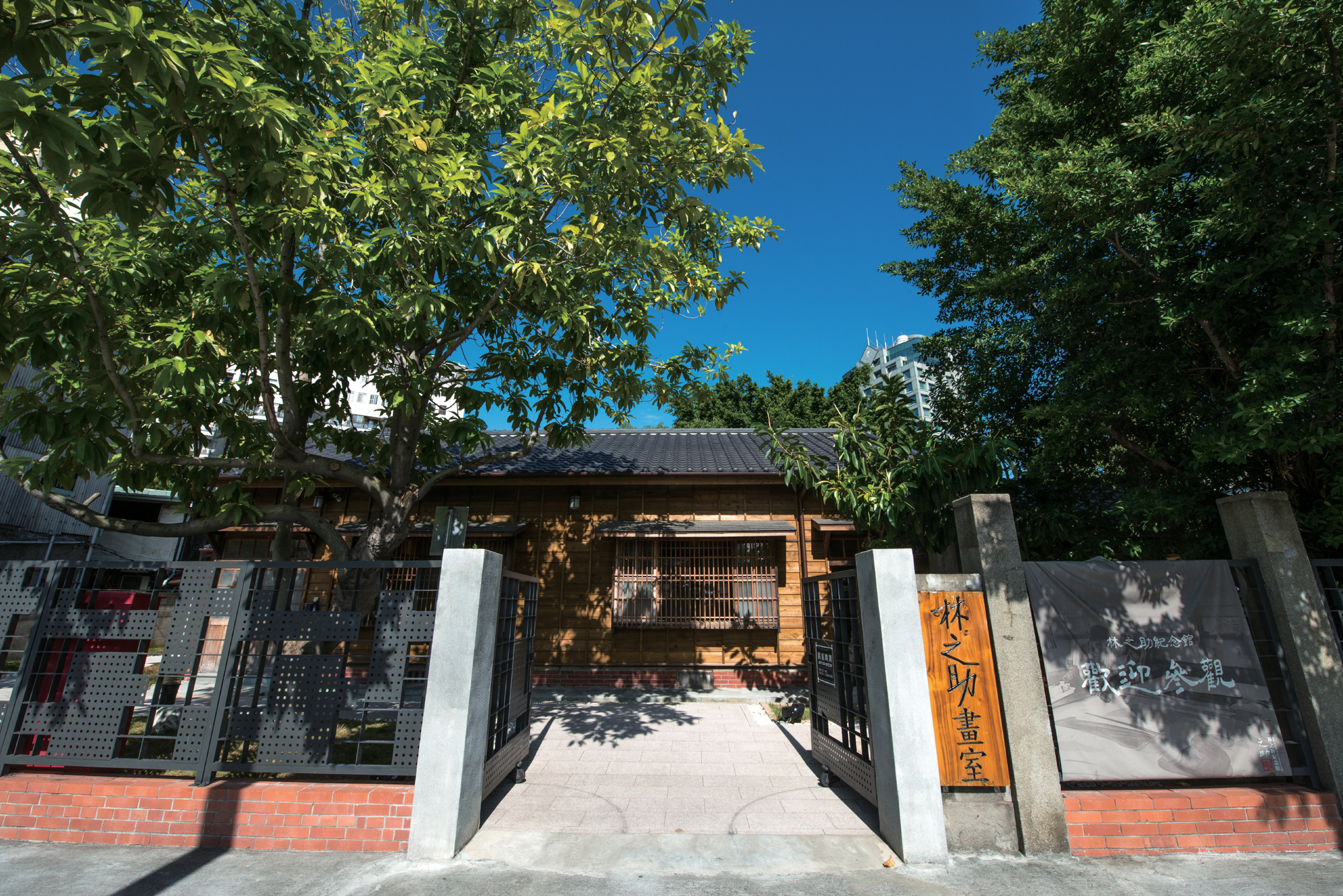 青い空に緑が映える林之助記念館には、外の喧騒を忘れさせる静かな時間が流れている。