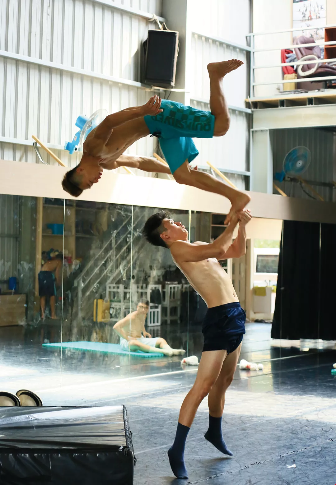 メンバーは毎日稽古場で練習を重ねて息を合わせている。写真は趙偉辰(下)と羅元陽。(林格立撮影)