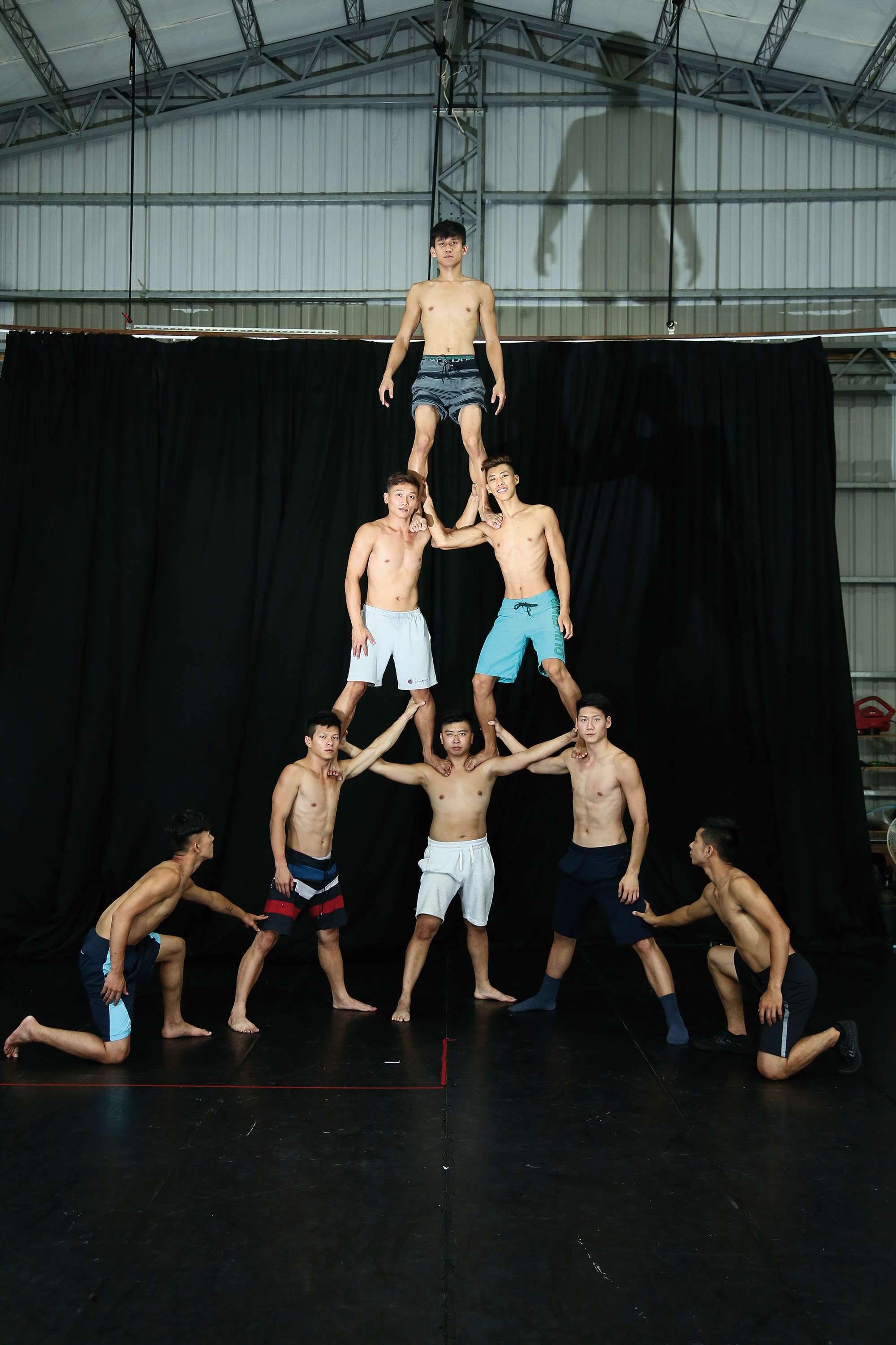 インタビューが一段落すると、林智偉は傍の電話を取った。出演の話らしい。写真を撮りますと声をかけると、ゆっくり歩いてきた。8人がピラミッドを組んだが、林だけ服を着ている。「ダメです。今は練習してないから」という。笑い声が広がった。メンバーは上へ上へと立ち上がり、林智偉が中央に立った。横のメンバーが彼の腕を引き、続いて一人ひとり着地した。