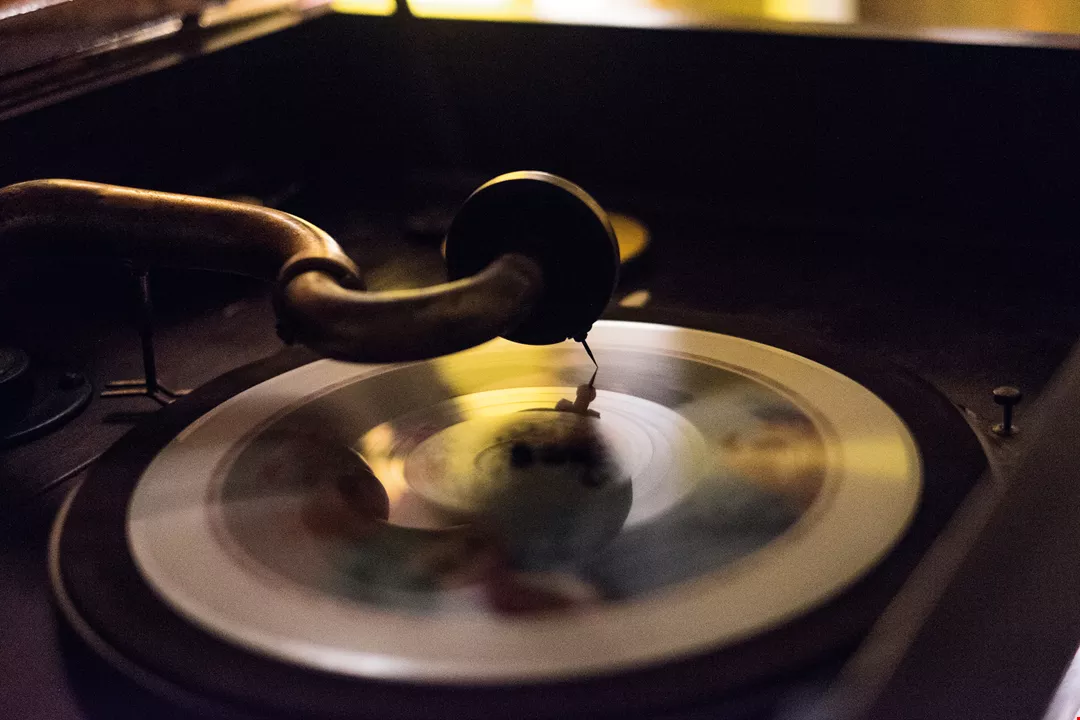 レコード盤の上を針が走ると、蓄音機から美しい音が流れ出す。