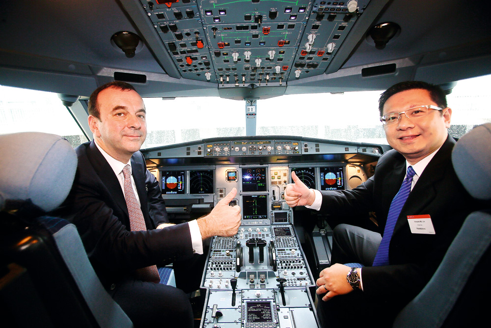 A330に乗る復興航空の林明昇董事長(右)とエアバス社アジア太平洋地域担当のジャン・フランソワ・ラヴァル副社長。