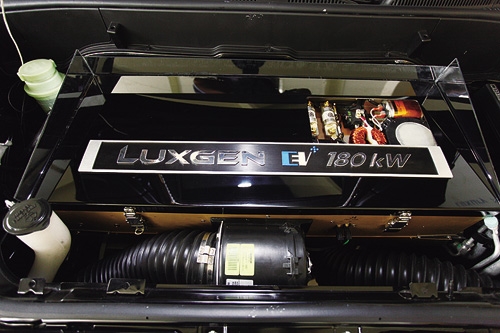 LUXGENのエンジンフードを開くと、エンジンの代りにモーターと電気制御装置があり、下には6000個余りの電池が入っている。