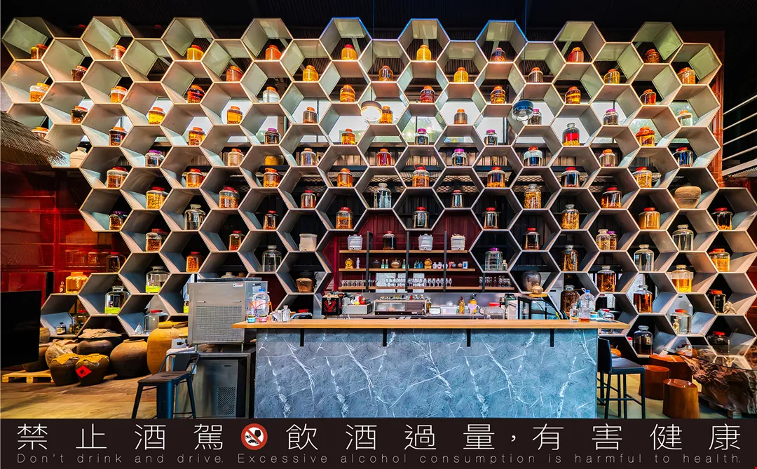 中福酒造に足を踏み入れた見学客は、薬酒がぎっしり並べられた蜂の巣状の飾り棚を目にする。