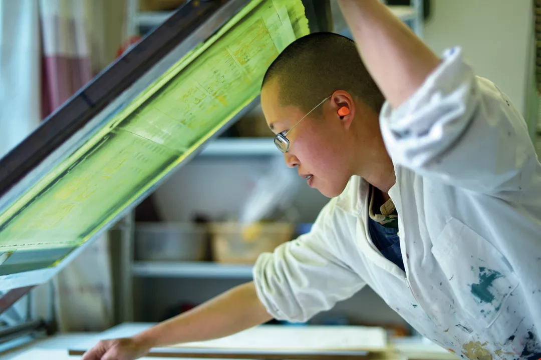 シルクスクリーンで少量印刷する黄珮珊。そのインクの厚みは作品の内容と呼応する。(慢工文化提供)