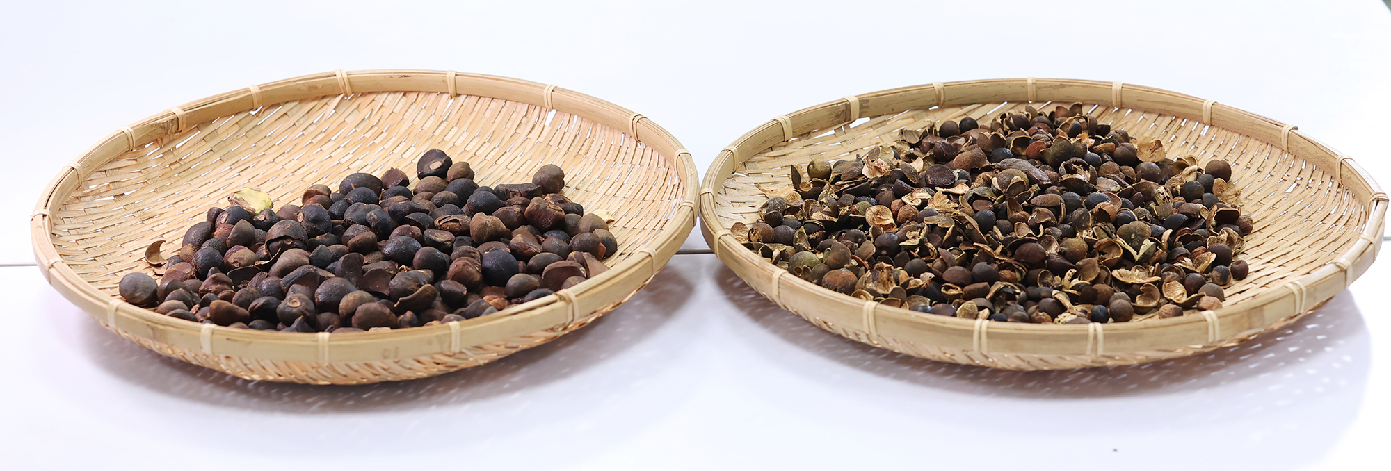 張為欽によれば、油茶の種子には三層の皮があるそうだ。一層目は果実の皮で、これは天日干ししたり乾燥させたりすればひび割れる。第二層は種の殻で、実を干すだけではこの殻までは乾燥しないので、搾油後の風味に影響を与えるという。第三層は薄皮だ。苦茶の種子はピーナッツのように薄皮があるのだ。ピーナッツは薄皮ごと食べた方が香ばしくて美味しいという人もいるが、油茶の種子の薄皮は非常に苦い。