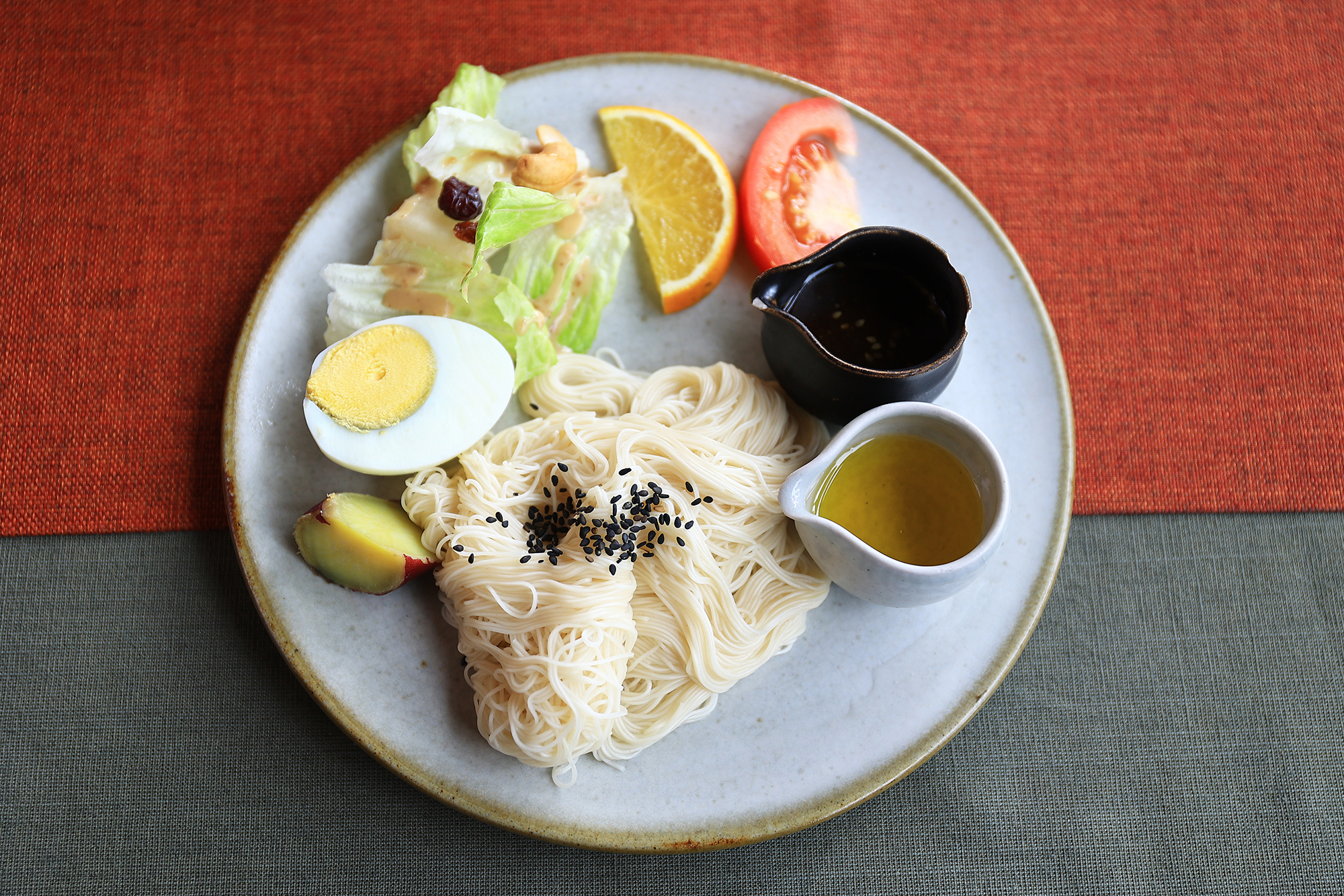 簡単に作れる「麺線」(素麺のような極細麺)の苦茶油和え。ヘルシーで美味しく、軽いけれど満足できる一品だ。