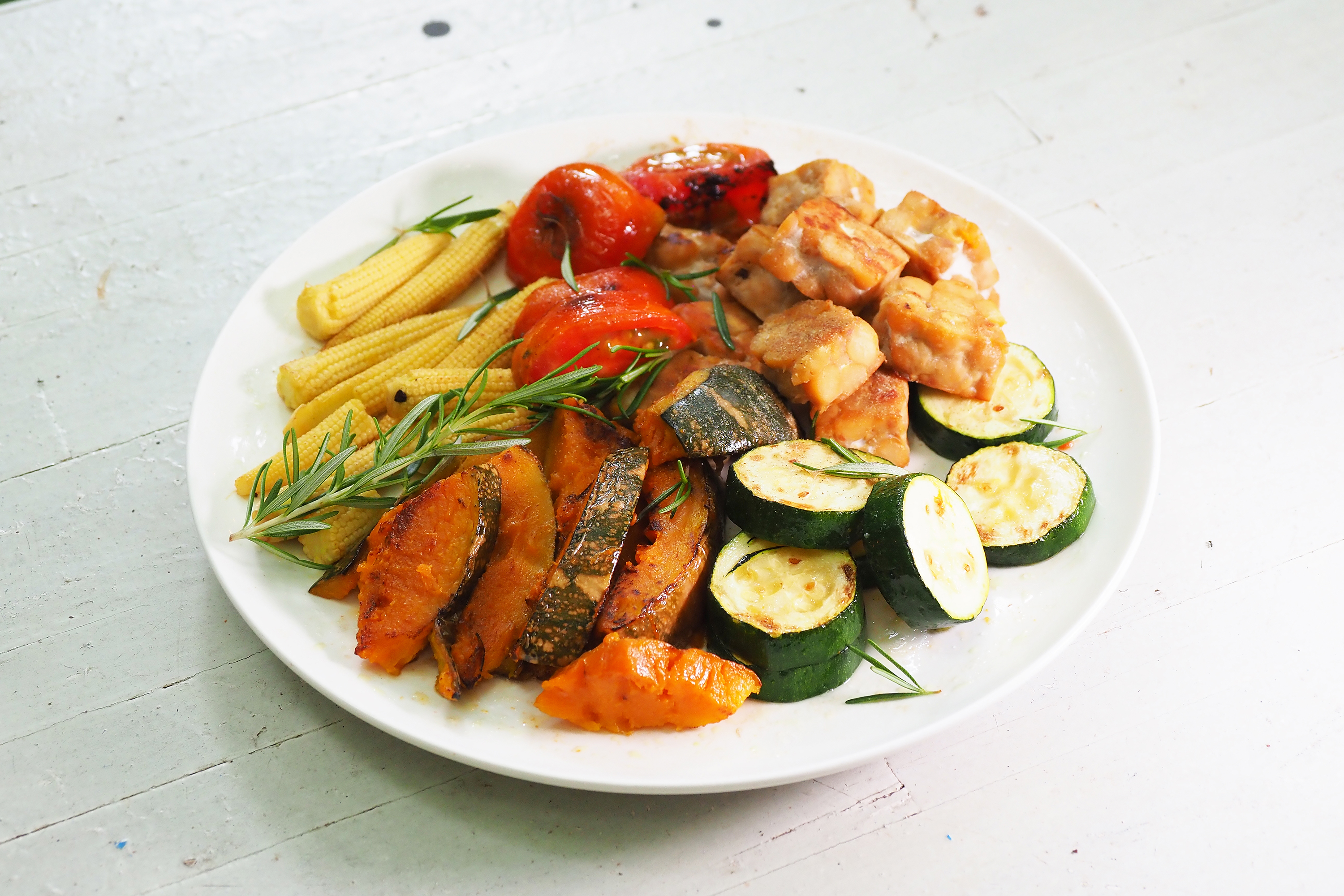 季節の野菜とひよこ豆テンペの苦茶油ソテー。