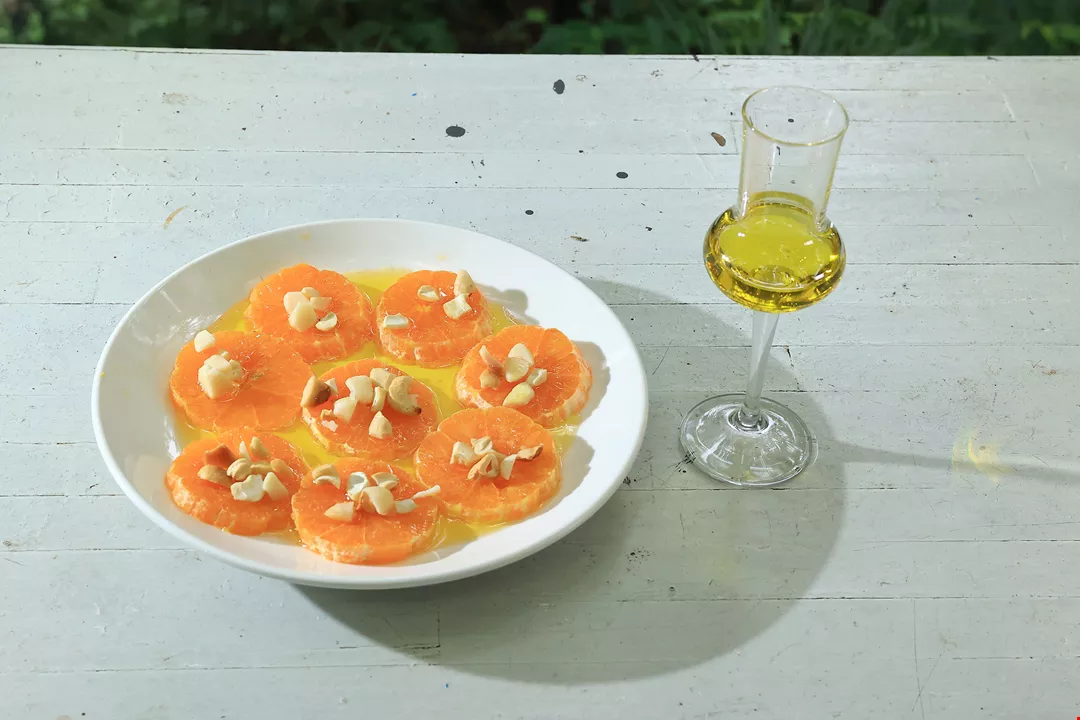 シシリア料理にインスパイアされたタンカンの苦茶油マリネ。最後にナッツを添える。