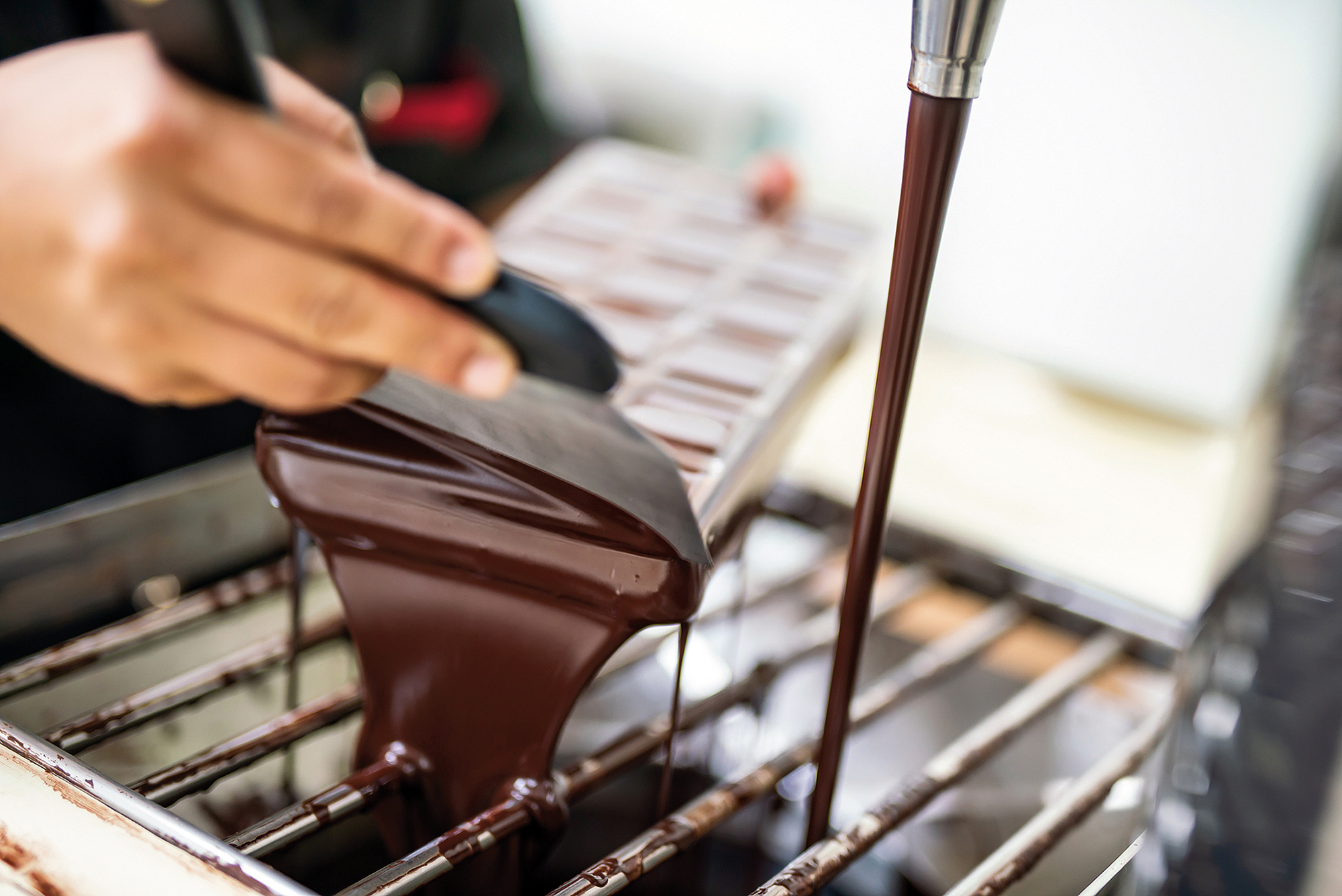 (下)テンパリングマシンで温度を調整したチョコレートは油のような光沢を見せ、冷ますとカリっとした歯触りになる。