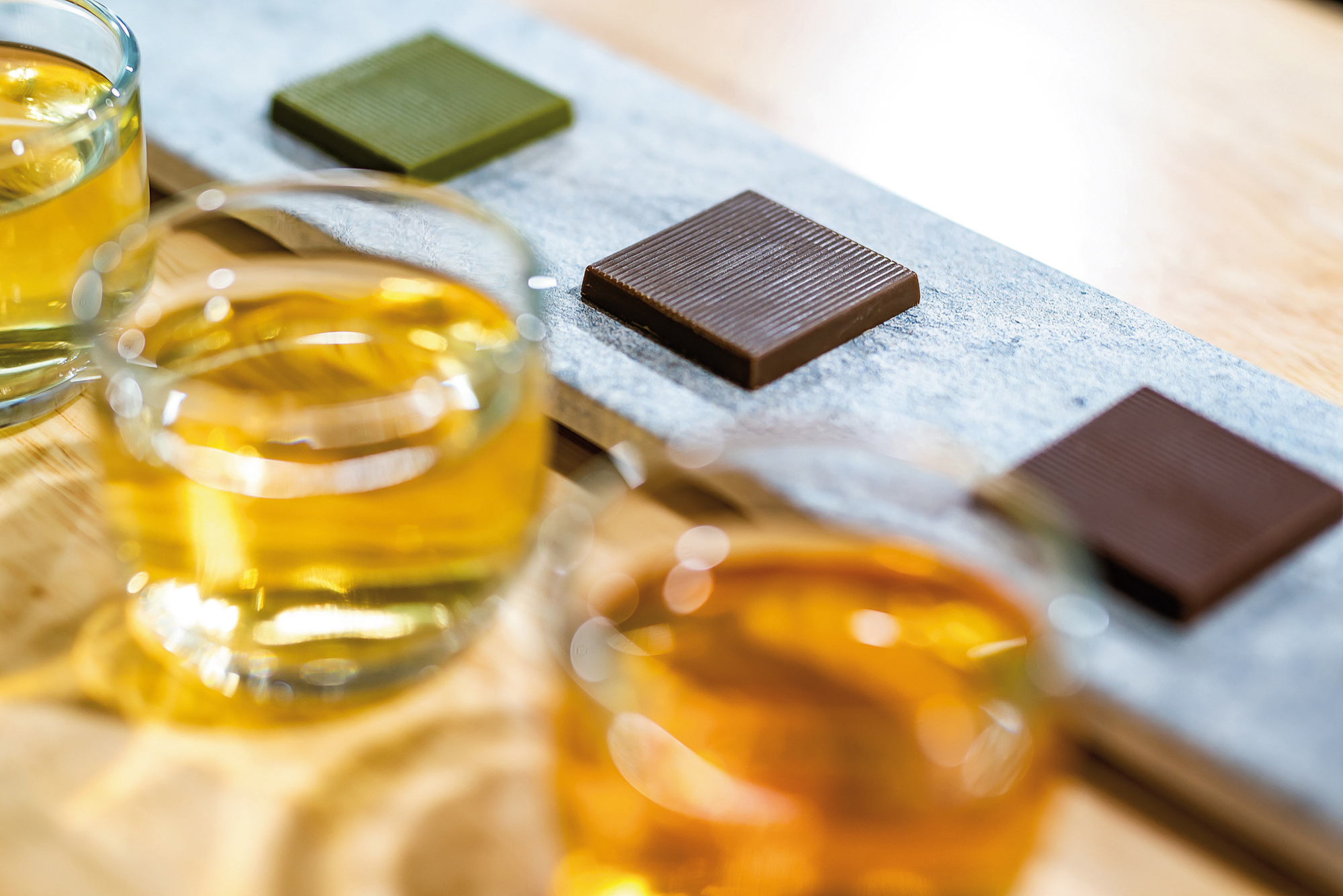 「Tea to bar」を謳うCOTEでは、八種の古典的な台湾茶の、同じくホールリーフを用いる。煮出した茶は使わない。また、渋みを抑えるために、顧瑋は巷の茶チョコレートのように粉ミルクで味を修飾するのではなく、なんと、台湾産の金珠大豆のきな粉を使った。これは穀類にも新たな道を開いた。