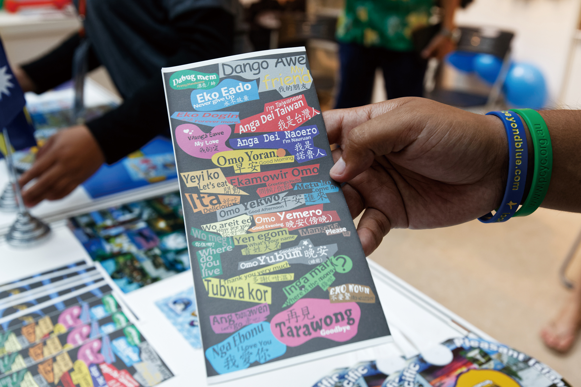 「ハロー!台湾」ナウル語と中国語と英語でのナウルからのグリーティング。右はインドのヘナタトゥー。(中央社提供)