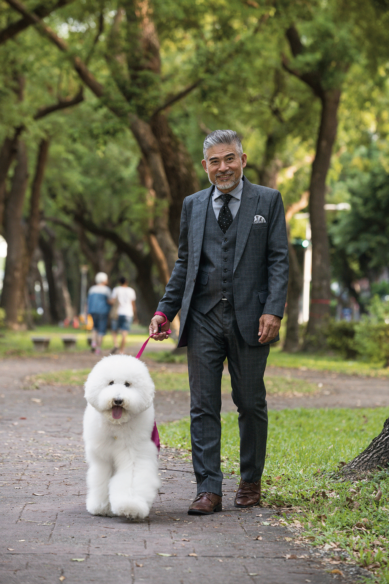 林天扶は、公園に散歩に来ていた犬を借りてきて一緒に写真に納まった。(荘坤儒撮影)