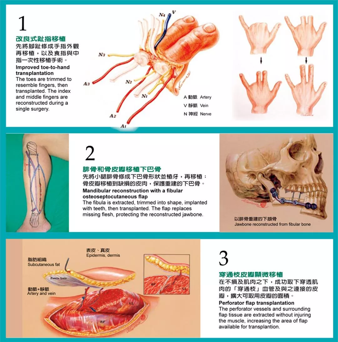 しかし、マイクロサージャリーとて万能ではない。面積が広く、複数の器官にまたがる損傷は、今のところマイクロサージャリーでは再建できず、顔や手の移植など、異体移植に期待するしかない。これも、林口長庚病院が異体複合組織移植センターを設立し、魏福全が主任を務めている理由である。