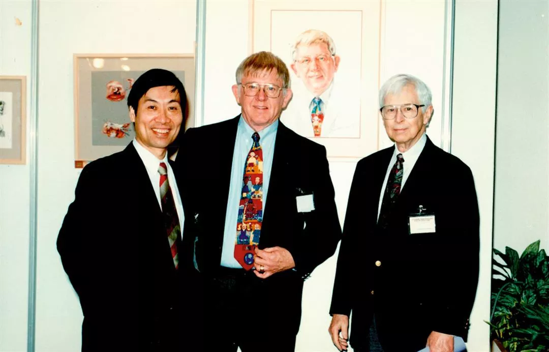 36年前、長庚病院の初代院長サミュエル・ノードホフ(中央)に命じられてカナダでの研修に赴いたことが、魏福全(左)がマイクロサージャリーの道へ進むきっかけとなった。