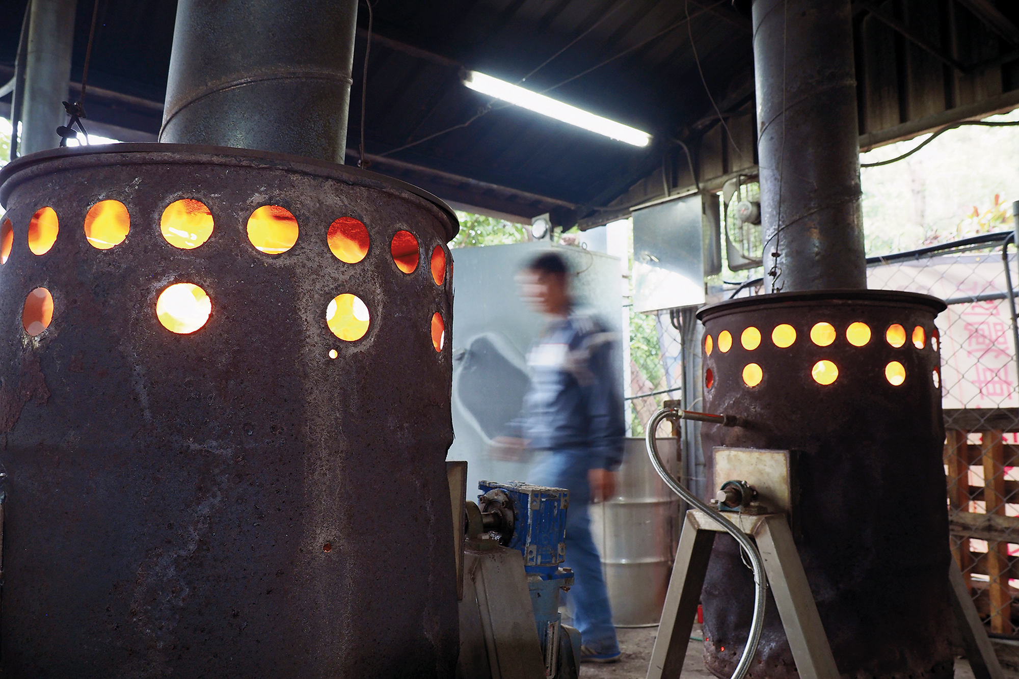 林弘萍によると、そのプロセスにはさまざまなポイントがある。焼く時点での菱の殻の水分含有率、鉄の桶に開けた2種類の穴の数、煙突の直径、焼成の時間など、どれも精確に設定されているのである。さまざまな実験を行なって最良の方法を確立するのに一年半の時間を費やしたという。