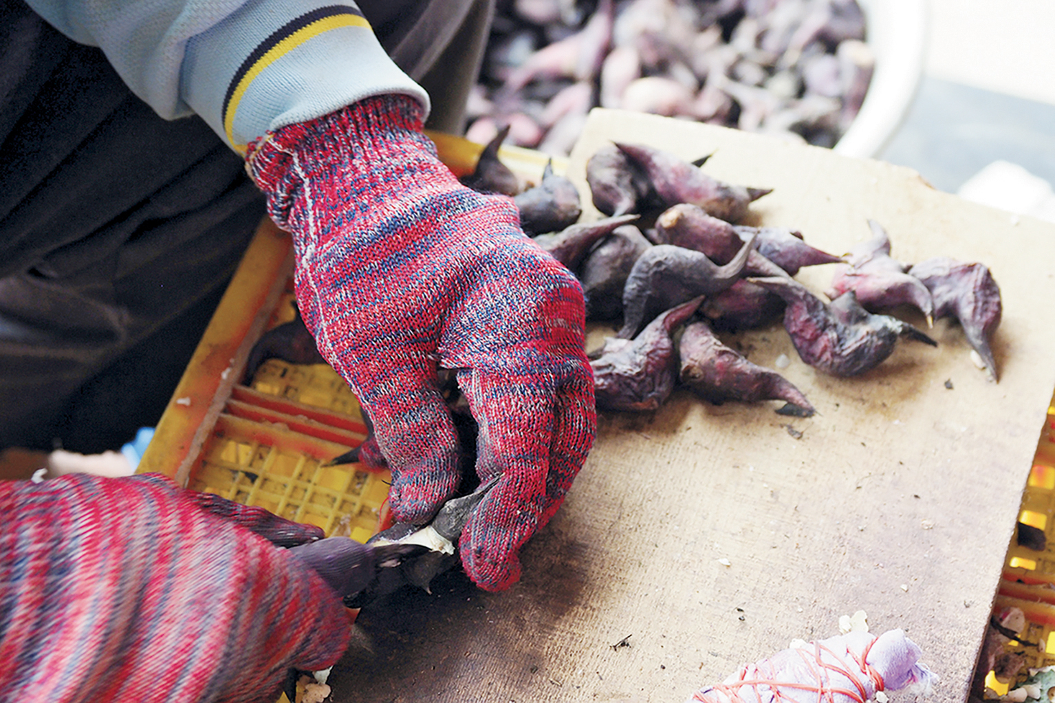 菱の季節になると家々の前で女性たちが輪になって座り、手際よく菱の殻を剥いていく。