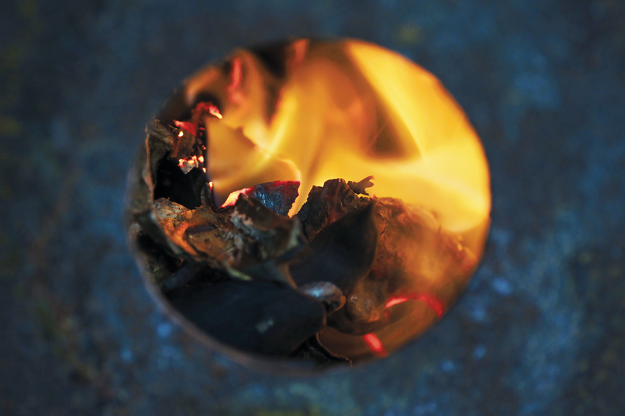 林弘萍が開発した特許取得技術。炎は上方にあり、下の菱殻は「乾留」によって炭となる。