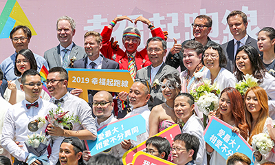 許多同志伴侶在同婚法施行當天舉行結婚典禮,並邀請祁家威證婚。(中央社)