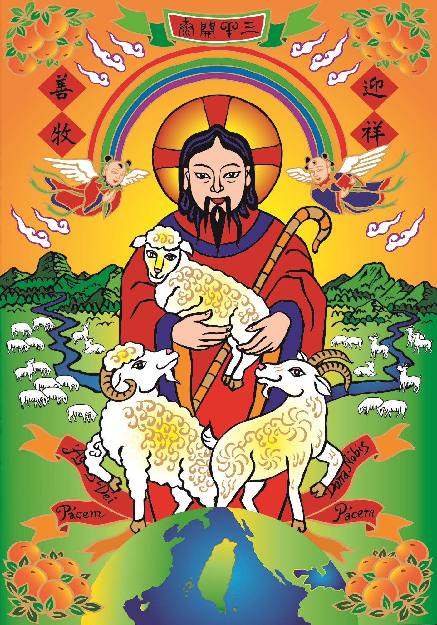 另幅〈耶穌善牧〉,羊是作品中的重要隱喻。耶穌既是「代罪羔羊」為眾人捨命,耶穌也是善牧,故羊也是信徒的象徵。畫面中,耶穌懷中擁抱著綿羊、山羊,象徵著一視同仁的慈愛,三隻羊的造型,也有東方「三陽開泰」的吉祥寓意。在人像背後,右邊是玉山、左邊為大霸尖山,並有活水源頭從山間湧出,灌溉大地,悄然呼應〈詩篇〉第23篇的句子:「主是我的牧者,我實在一無所缺。祂使我臥在青綠的草場,又領我走進幽靜的水旁。」