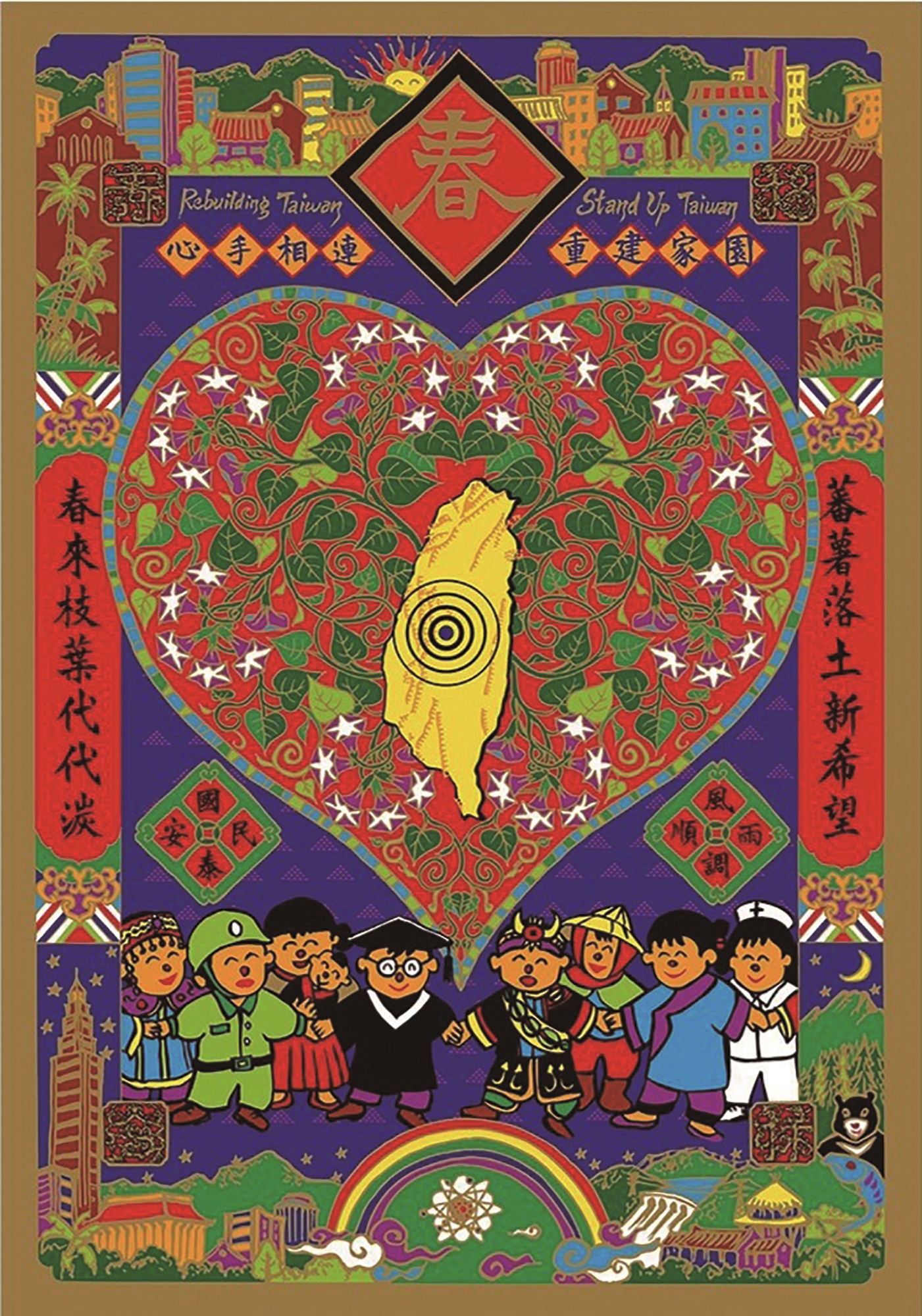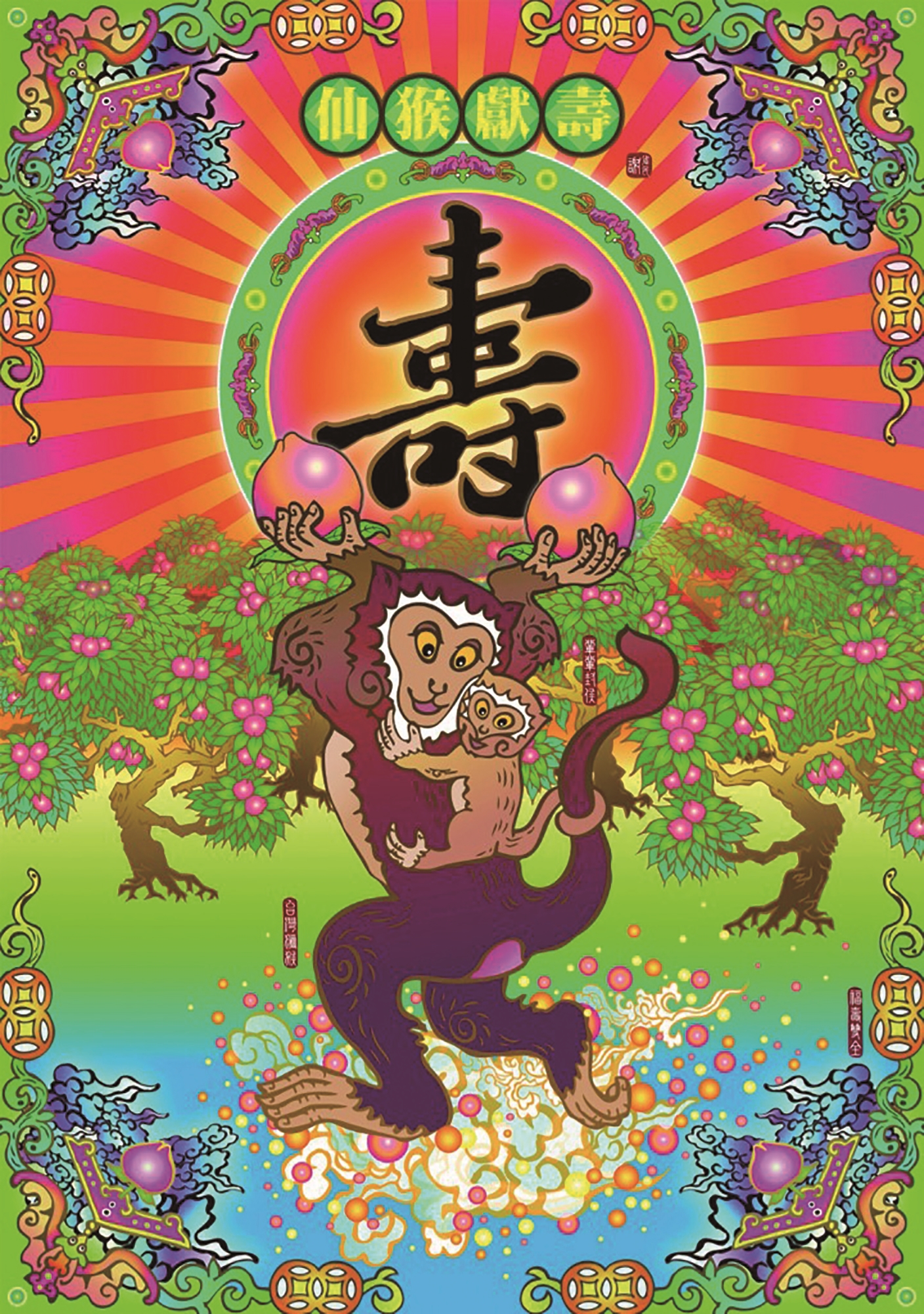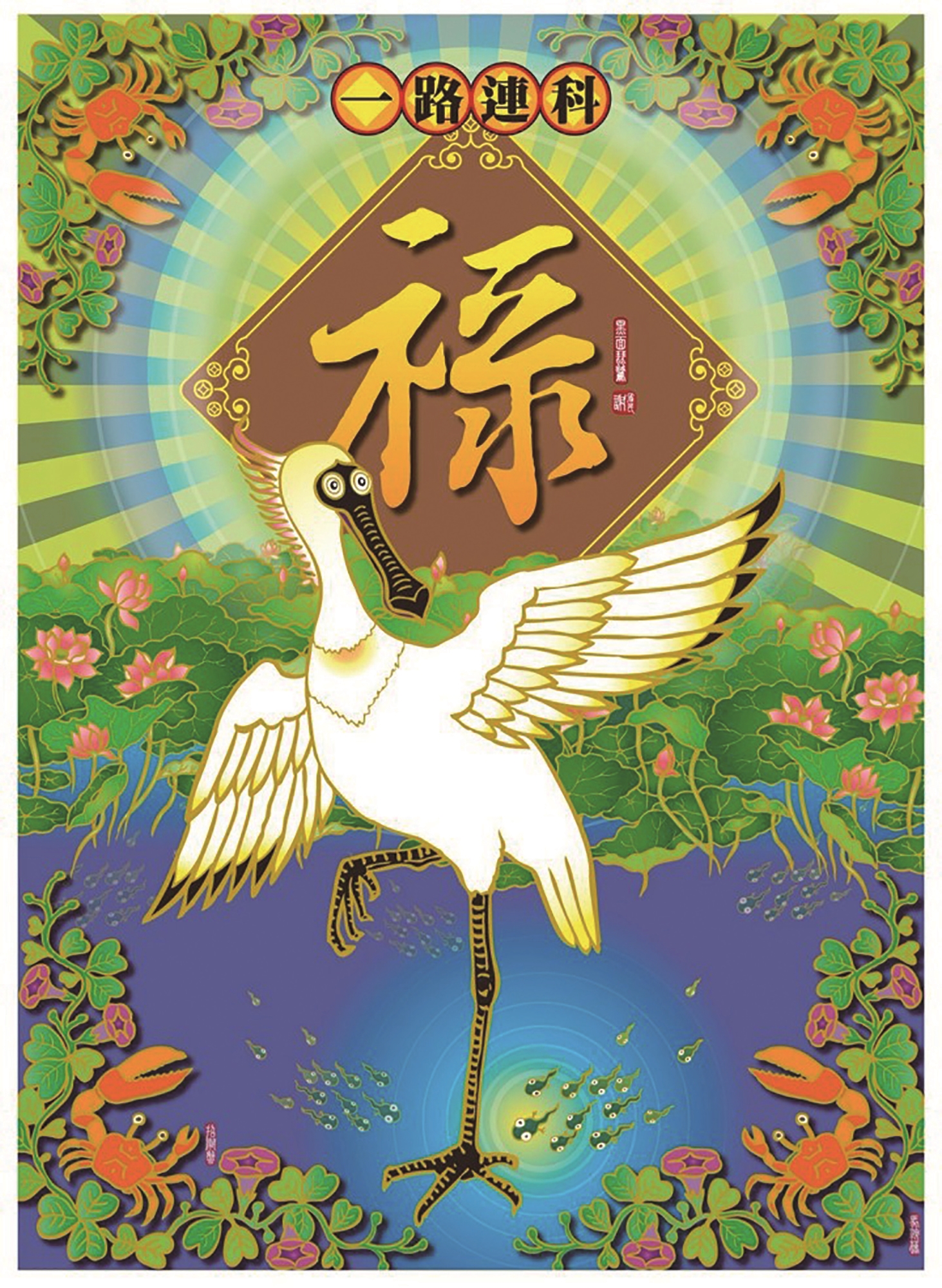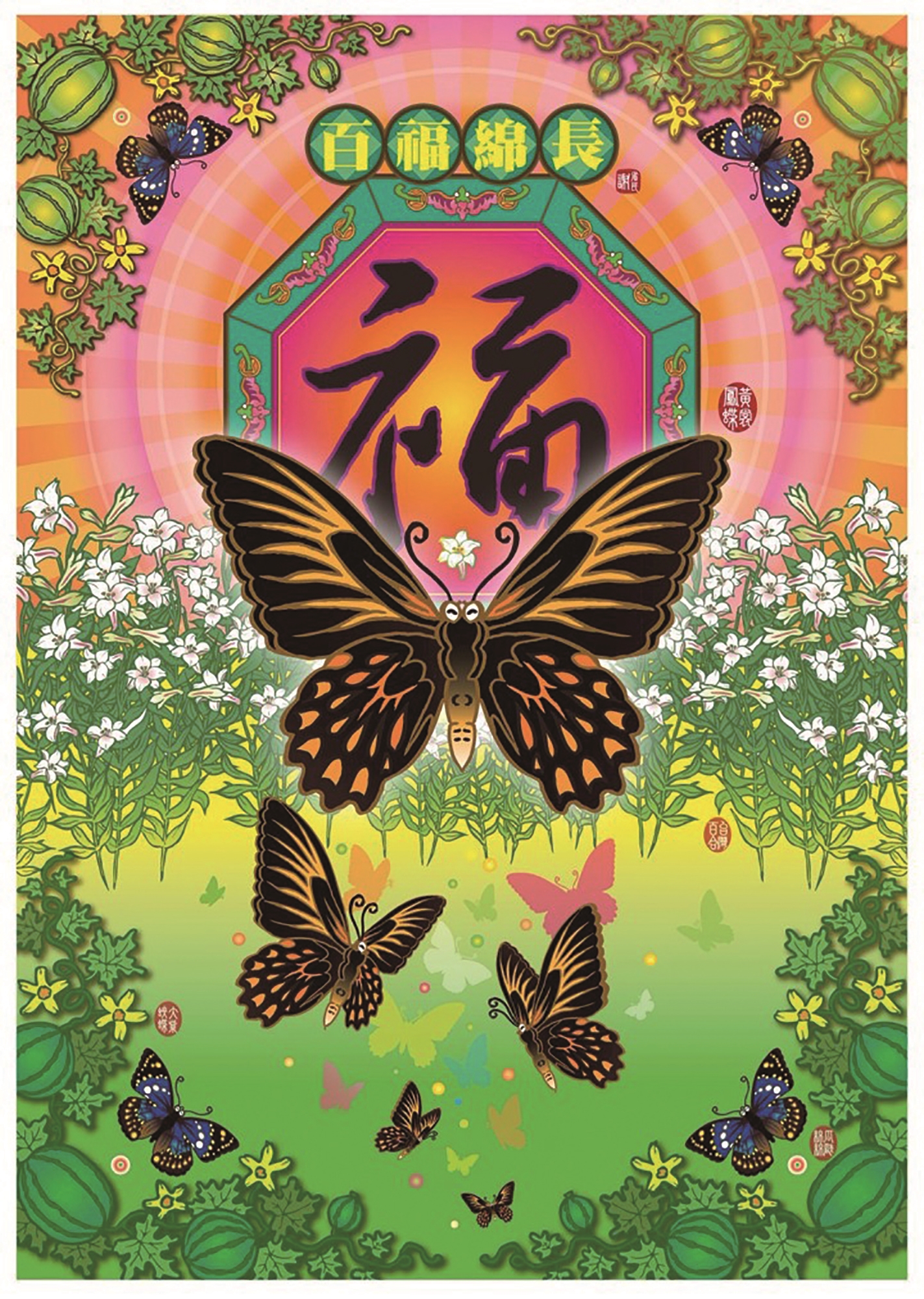 以及〈台灣福—百福綿長〉〈台灣祿—一路連科〉〈台灣壽—仙猴獻壽〉等作品,以諧音結合台灣特有種的蝴蝶、百合花、過境台灣的黑面琵鷺、台灣獼猴等等,同時融合了台灣濕地、高海拔果樹的桃樹等地景風光,展現出生態、自然的豐沛面貌。
