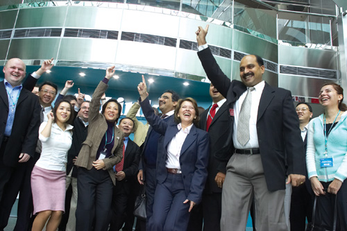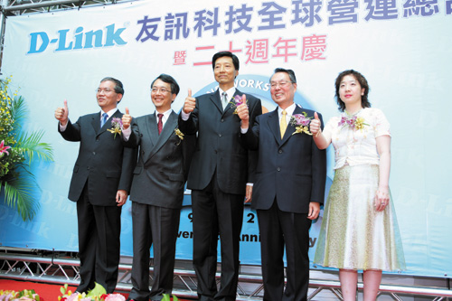 20週年慶當天,友訊在台北內湖的D-Link全球營運總部正式啟用,全球友訊員工齊聚致賀(右圖),而外貿協會董事長許志仁(左一)、宏硍偎帠郈鴗H施振榮(右二)及打造無線網路新都的台北市研考會主委周韻采(右一)都到場觀禮。左二為友訊科技總經理廖志誠,中為董事長高次軒。