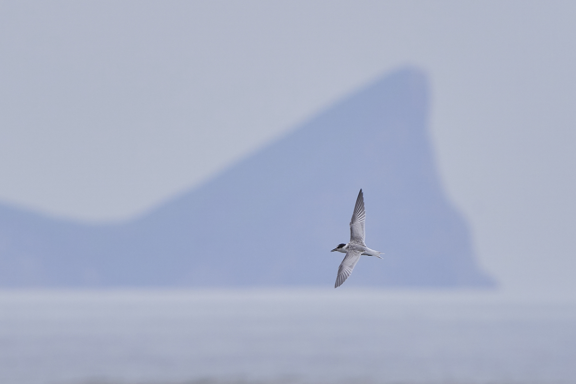 展翅翱翔的小燕鷗與龜山島相互輝映。(宜蘭縣野鳥學會提供)