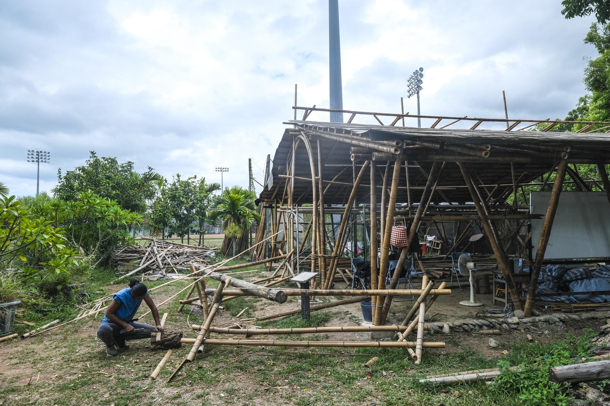 Ahung Masikadd และลูกชาย (Benglay Masikadd) ของเขา ขณะกำลังสร้างอาคารไม้ไผ่ในโรงเรียนประถมศึกษาหนานหวัง เมืองไถตง