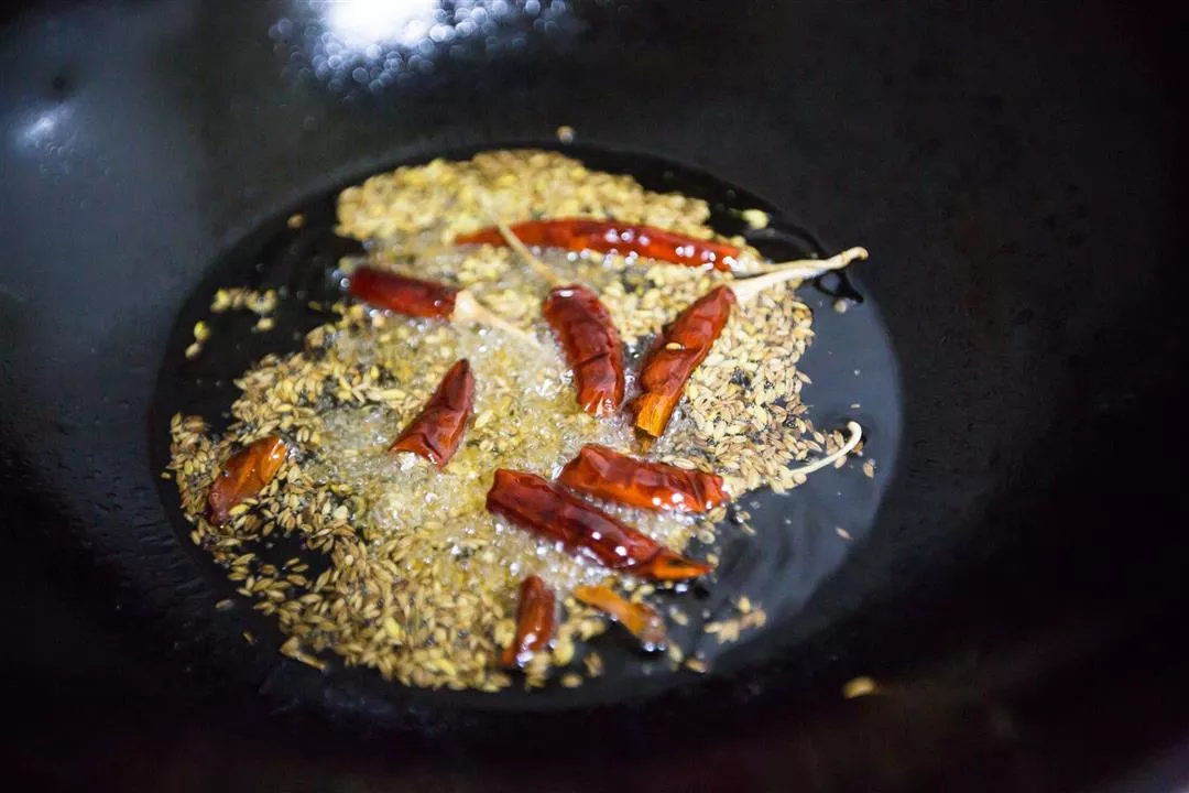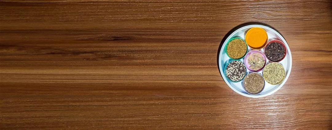 เครื่องเทศ “Anjara box” ที่ ทุกครอบครัวของชาวอินเดีย ต้องมีไว้ในครัว รสชาติพิเศษ ต่างๆ มาจากเครื่องเทศเหล่านี้ แดง: พริกไทยดำ� ขาว: ผักชีล้อม ม่วง: ผงยี่หร่า น้ำ�เงิน: เมล็ดมัสตาร์ดและ ถั่วดำ�อินเดีย เขียว: ลูกซัด (Fenugreek) เหลือง: ขมิ้น กลาง: กระวาน และขิง