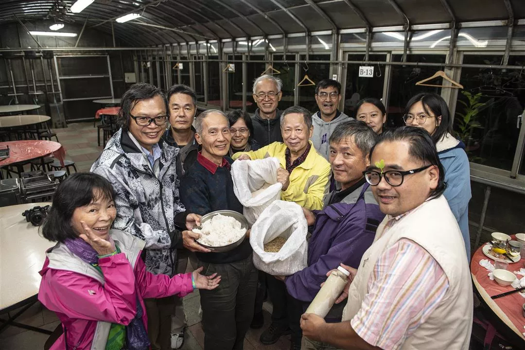 สมาชิกชมรมนาข้าวข้าวเผิงไหลพันธุ์ดั้งเดิมที่จู๋จื่อหู มารวมตัวกันอย่างพร้อมหน้า ชิมข้าวใหม่ด้วยความยินดี