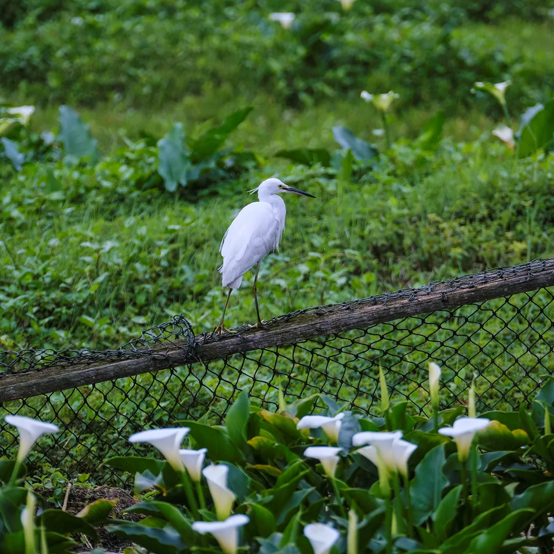 นกยางเปียเดินเล่นเพลิดเพลินอย่างสบายใจในไร่ดอกคาลล่า ลิลลี่ ท่ามกลางความเงียบสงบบนภูเขา